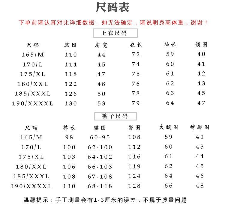 165/M; 170/L; 175/XL; 180/2XL; 185/3XL; 190/4XL