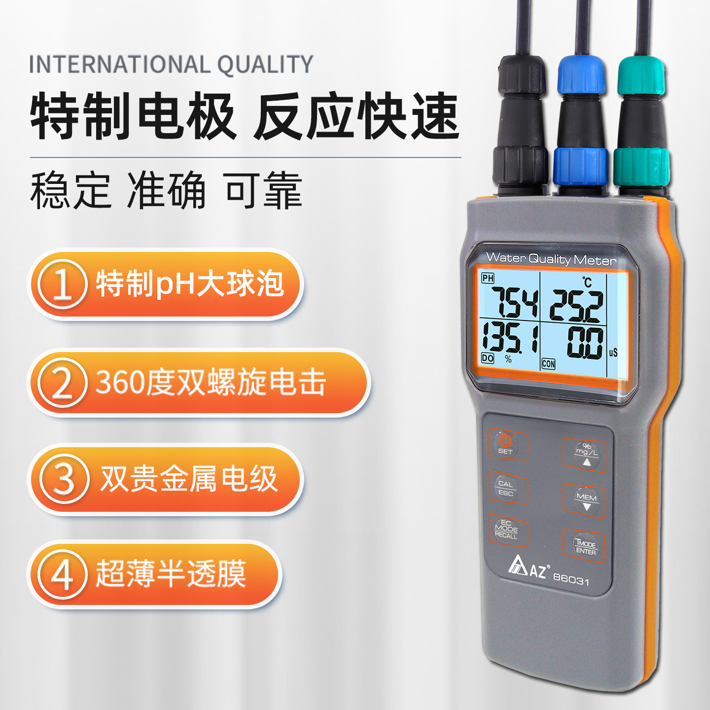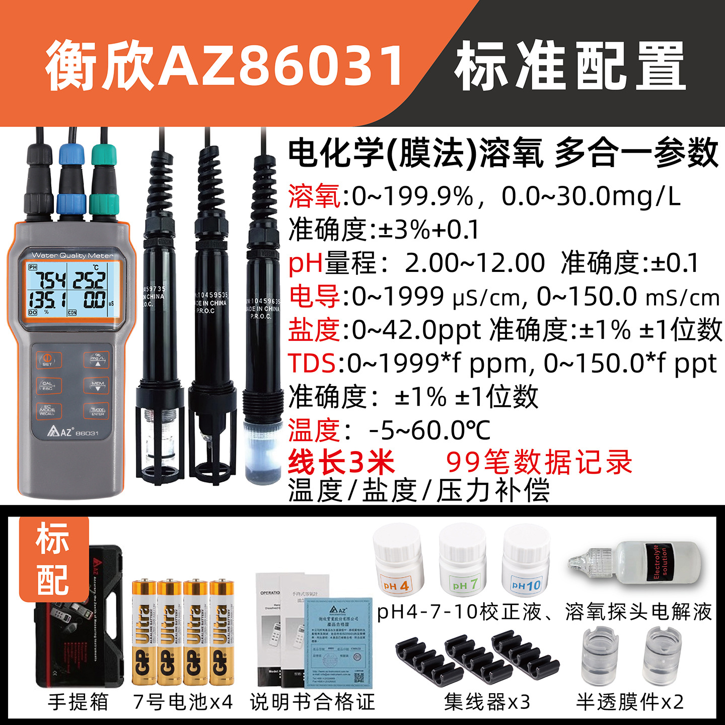 AZ86031 многофункциональный; AZ86021 в стандартной комплектации входит один датчик растворенного кислорода, который может быть дополнительным.; AZ8403; AZ8413; pH-зонд VZ863PAZ; Датчик проводника VZ833PAZ; Зонд растворенного кислорода VZ843PAZ; 8403 специальный стержень для испытания растворенного кислорода VZ840PBZ1; 86031 8413 специальный набор датчиков растворенного кислорода из 5 мембран + 2 бутылки электролита; 8403 специальная пленка для испытания растворенного кислорода, уплотнительное кольцо без шт./кор.; AZ86031 Английская версия; AZ86021 Английская версия; AZ8403 Английская версия; AZ8413 Английская версия