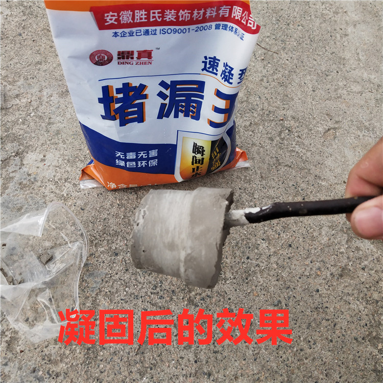 2、根据其中大小捏成团,放置几分钟(待初凝稍硬时)塞进漏水口并用木棒挤压,轻砸使其向四周挤实,即可瞬息止漏。