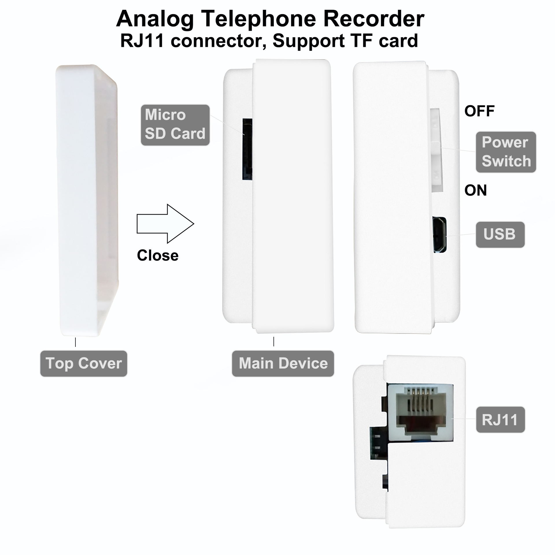 电话录音机有两个端口(线路1和线路2),一个端口连接到电话主线,另一个端口连接到电话线端口,开关拨到ON位置。