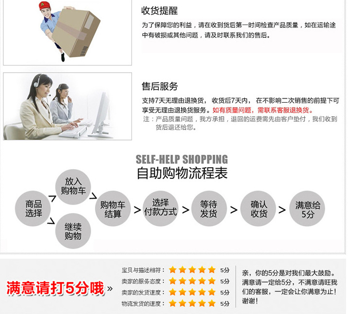 12:评价问题:我们珍惜每一个好评,5星级服务,5星质量,5星信誉!如果您有任何不满意,请先跟我们沟通,相信任何合理的问题都可以迅速给您解决。无任何沟通,贸然给出中差评,并不能解决任何问题。中肯的批评我们虚心接受,我们的工作肯定会存在这样那样的失误,也非常愿意为此承担责任。出现了问题,彼此之间多一份冷静和坦诚,请试着换位思考一下,相信任何问题都会迎刃而解的。我们欢迎这样中肯、宽容的顾客,相信我们能成为好朋友。不欢迎个别高傲,不尊重别人劳动的买家,还有个别买家为了达到自己的目的,以恶意攻击卖家
