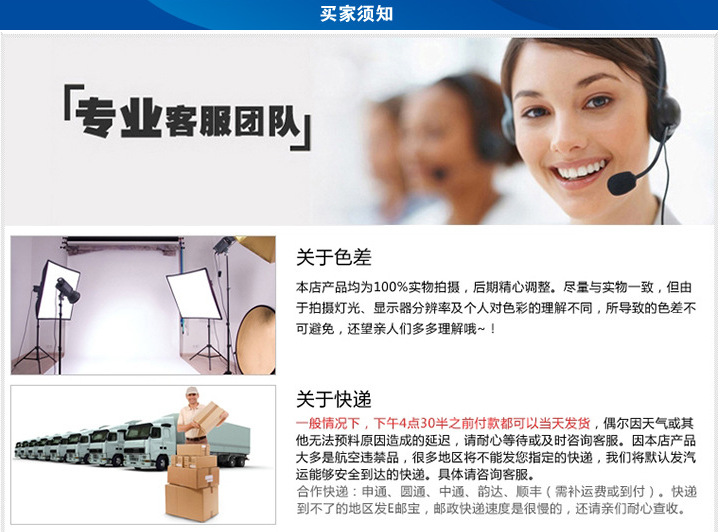 5:特别注意事项(货运物流):正常情况下当天下午12:00前拍下的货物我们会及时安排当天发出,如遇到缺货或其它特殊情况我们会时间联系你们.12:00以后的订单视当天情况而定.
