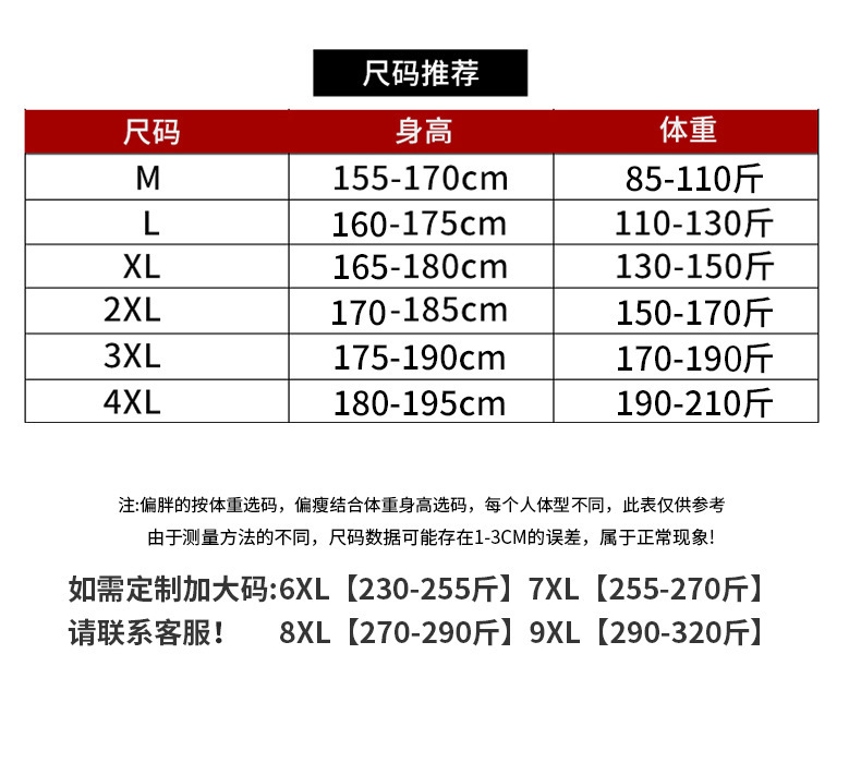 M/165; L/170; XL/175; 2XL/180; 3XL/185; 4XL/190; 5XL/195; 6XL/200