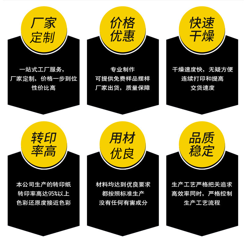 6、打印后保存期长,色彩鲜艳,细节完整,颜色还原度高。公司花巨资投入热升华转印纸生产流水线,可满足各种转移印花相关材料的生产,是中国专业生产热升华转印纸发展很快的企业。主要用于化纤织品、服装服饰面料、写真横幅、旗、织带、陶瓷、金属、马克杯等领域的应用,在吸墨、快干、卷曲及转移率等方面都十分好。