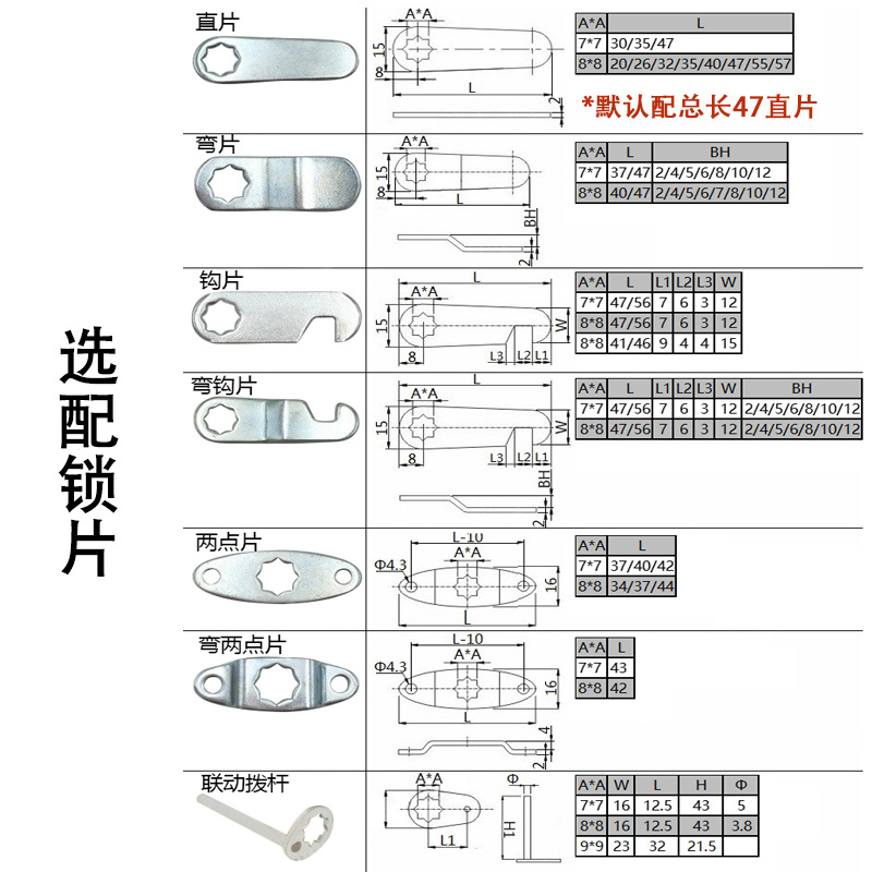 注:默认锁片总长47mm无钩直片
