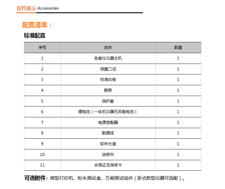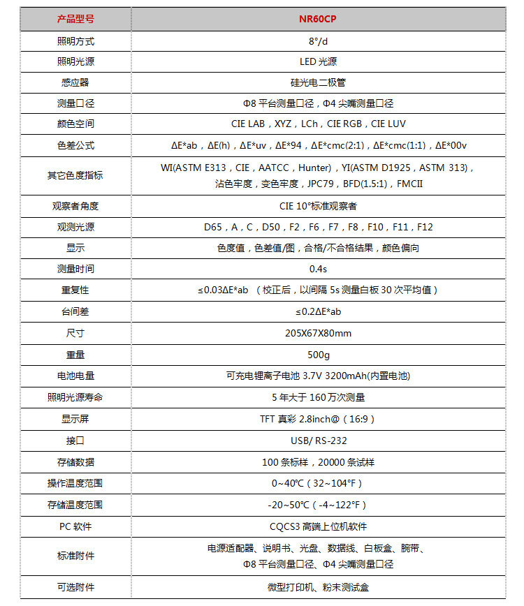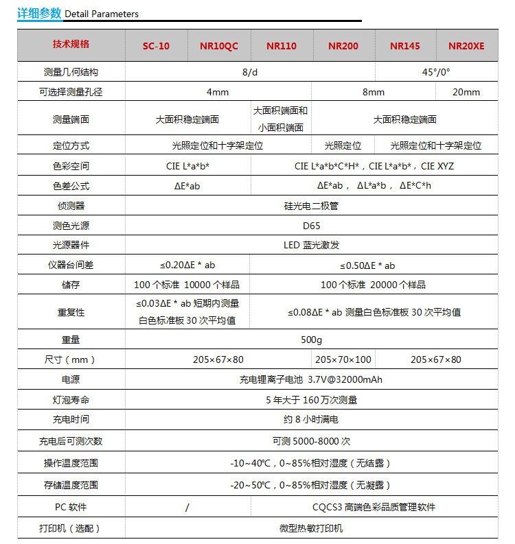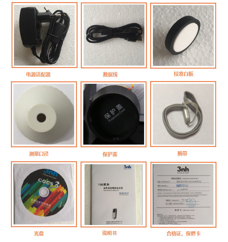 Обычный экономичный колориметр sc-10; Универсальный NR-10QC; Высокая точность NR110 (с доской и программным обеспечением); Высокоточный NR200 (с доской и программным обеспечением); НД145 (45 ° Измерение); NR20XE (диаметр 20 мм); NH300 (плата + программное обеспечение + точность 0.07); NR60CP (плата + программное обеспечение + точность 0.03); NH310 (плата + программное обеспечение + патент + 0.06); Спектр терки YS3060 (двойной калибр 4+8 мм); Спектр терки YS3010 (8 мм); Прорезь YS3020 (индивидуальный диаметр, 1*3 мм); Растечковое разделение NS810 (D8 разделение +8 мм); Стержневое разделение NS800 (45/0+ точность 0,04); Растечковое разделение NS820 (D8 сплит +4мм); Терка спектр NS808 (эксклюзивно для дорожных знаков); TS7700; Коробка для испытания порошка в сборе