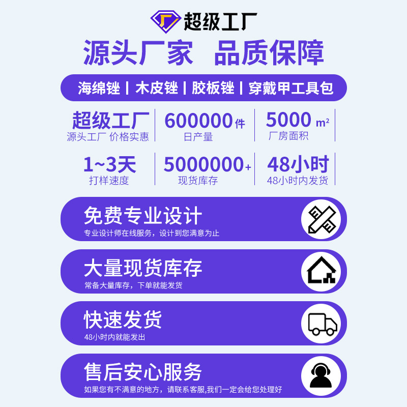 3、 样品、打样及新产品开发:现有款式免费提供样品,常规产品打样时间为3~7天。新产品开发,需设计新款图案、定制某些非常规砂纸等,需根据实际情况而定。
