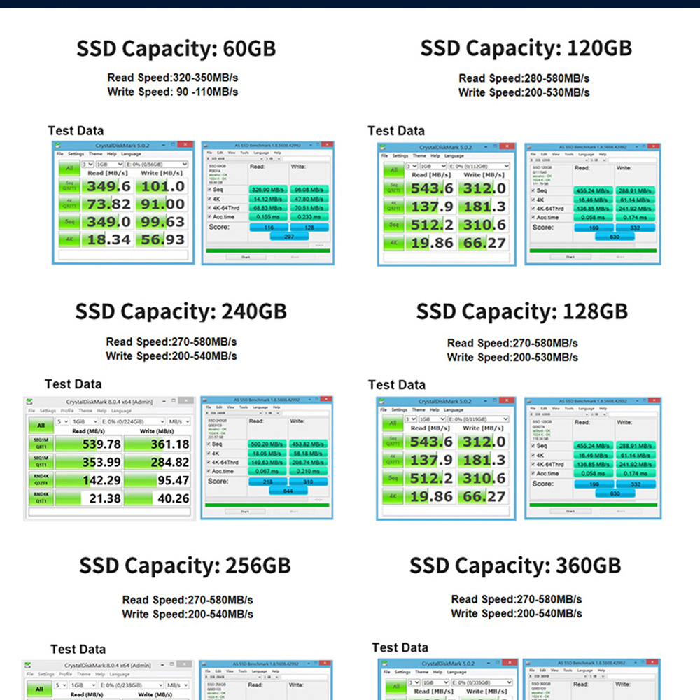 2,5 дюйма 60 ГБ; 2,5 дюйма 64 ГБ; 2,5 дюйма 120 ГБ; 2,5 дюйма 128 ГБ; 2,5 дюйма 240 ГБ; 2,5 дюйма 256 ГБ; 2,5-дюймовый 360GB; 2,5-дюймовый 480GB; 2,5 дюйма 500 ГБ; 2,5 дюйма 512 ГБ; 2,5-дюймовый 720 ГБ; 2,5-дюймовый 960GB; 2,5 дюйма 1 ТБ; 2,5 дюйма 2 ТБ