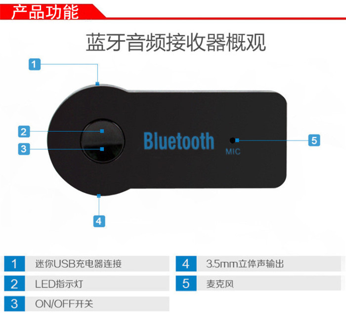 产品功能:蓝牙接收器、车载蓝牙接收器、汽车蓝牙接收器、AUX蓝牙接收器、音频适配器