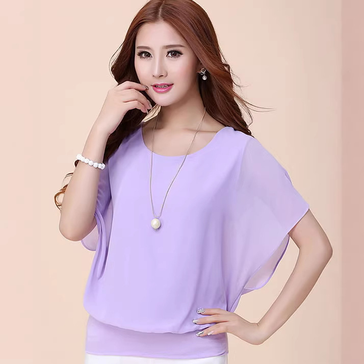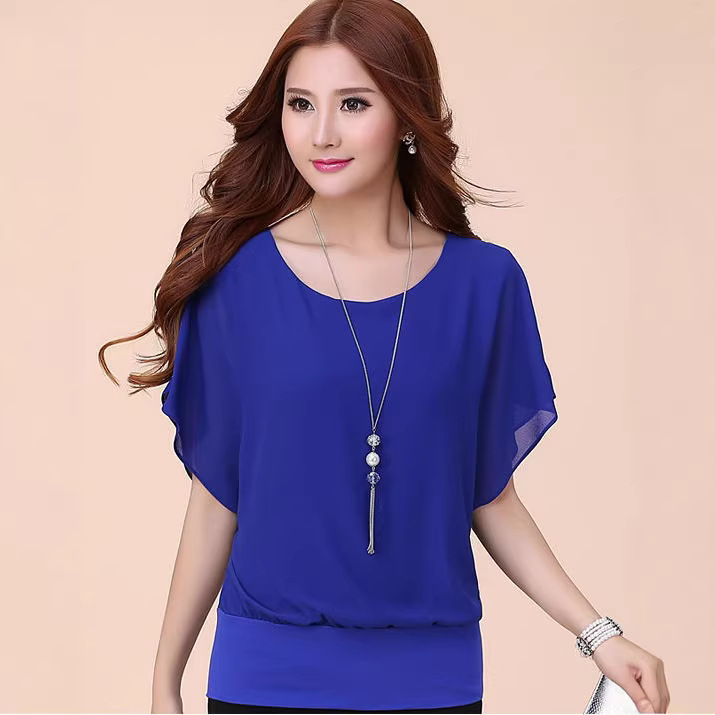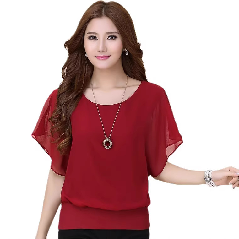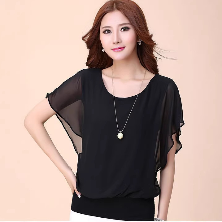 Летняя женская шифоновая блузка 2026 года, новая модель, с эффектом двухслойности, рукавами «летучая мышь» и вставками из шифона, для похудения фигуры