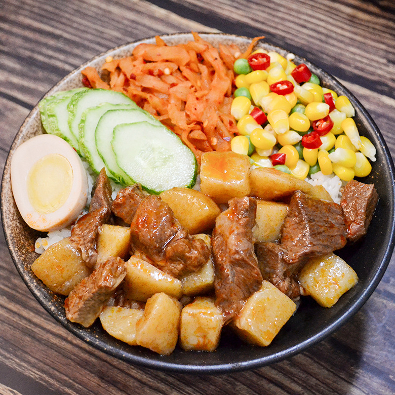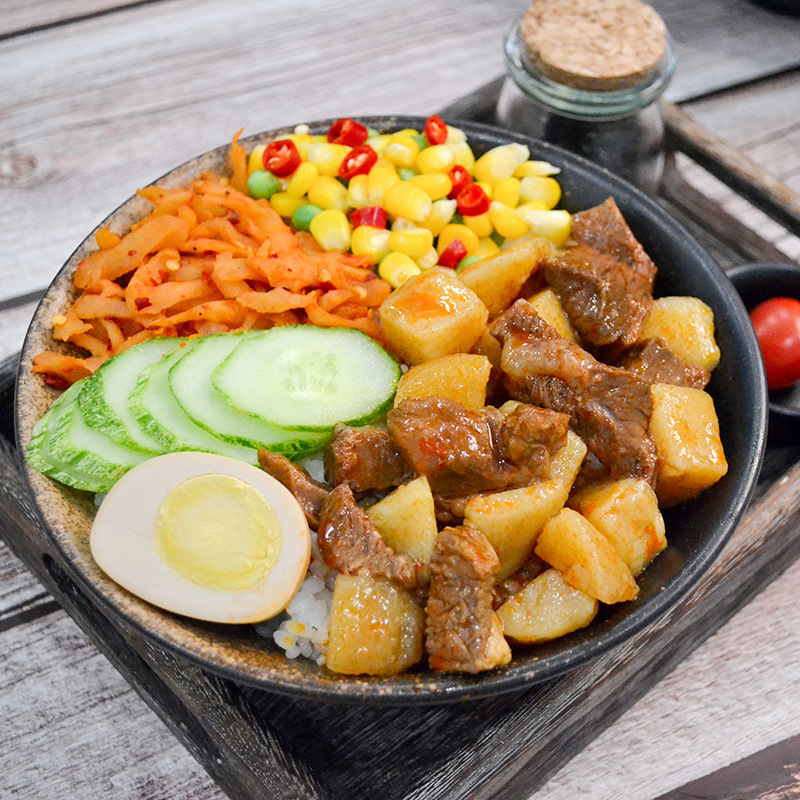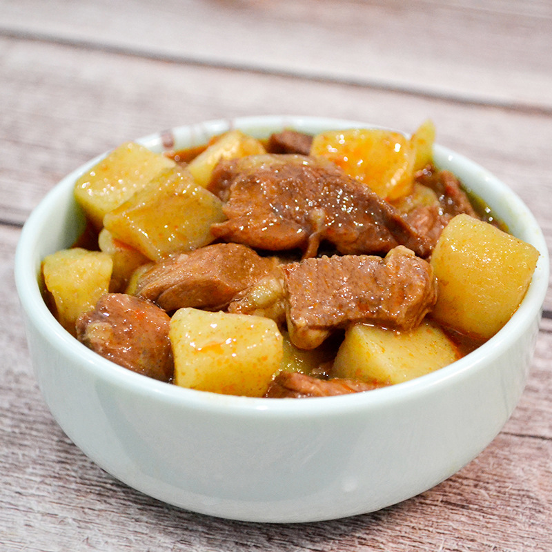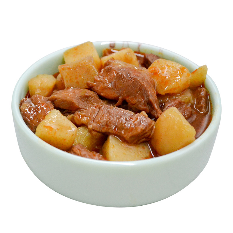 Говядина, вода питьевая, картофель, соль пищевая, масло растительное, паста фасолевая, сахар, перец красный маринованный, соевый соус пивоваренный, уксус, имбирь, лук зеленый, чеснок.