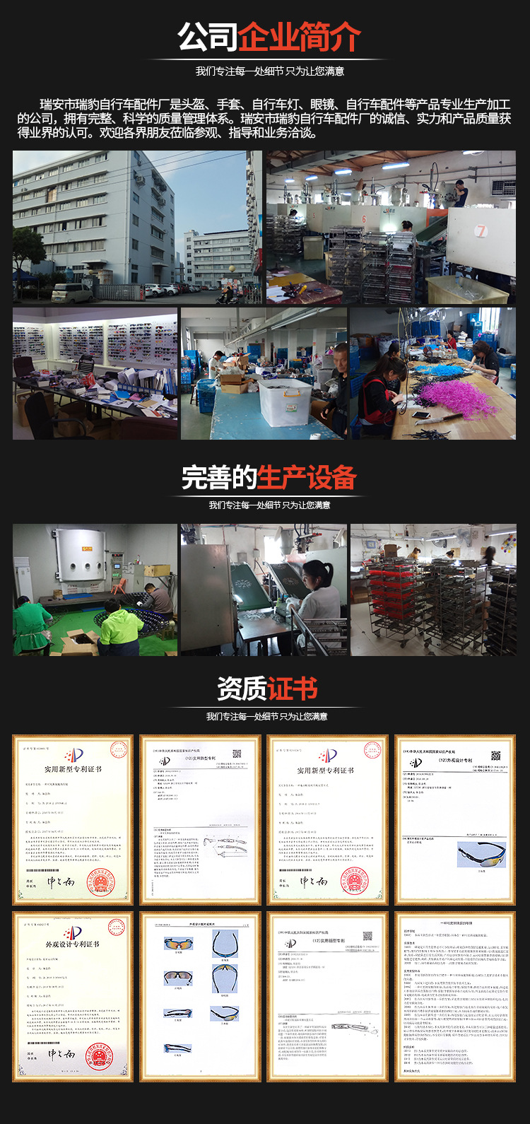 瑞安市瑞豹户外用品有限公司是运动眼镜、运动护具、运动装备等产品专业生产加工的公司,完整、的质量管理体系。公司的诚信、实力和产品质量获得业界的认可。欢迎各界朋友莅临参观、指导和业务洽谈。
