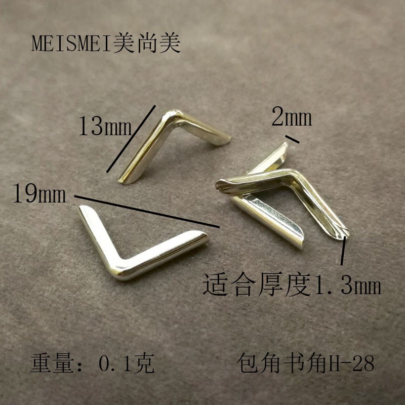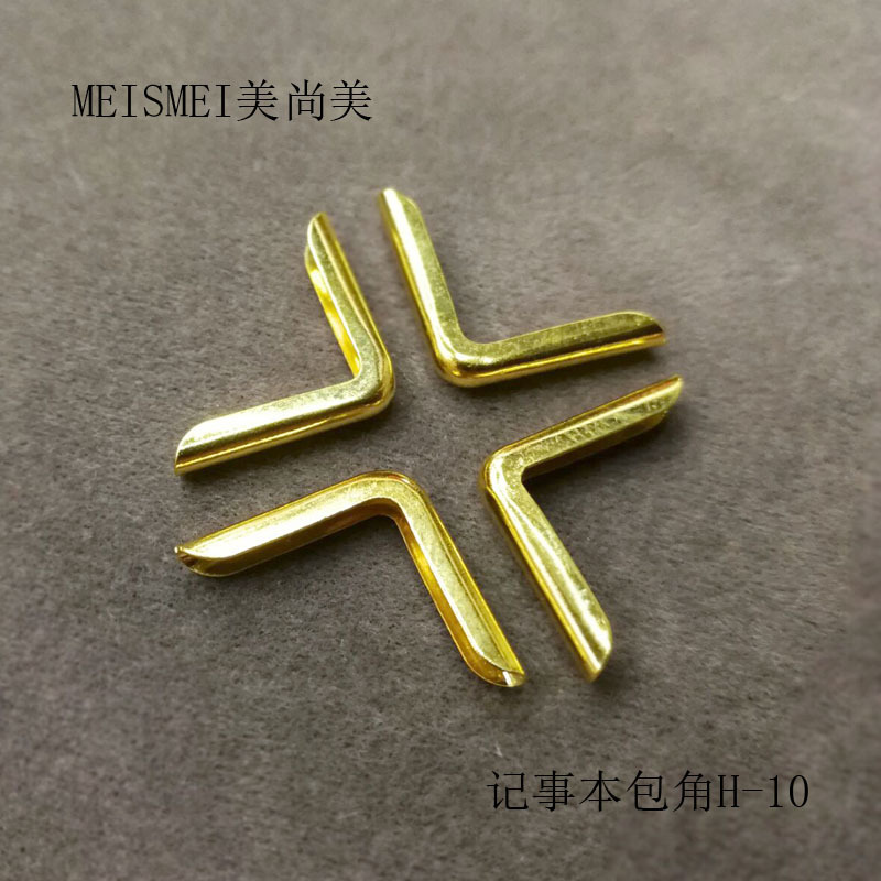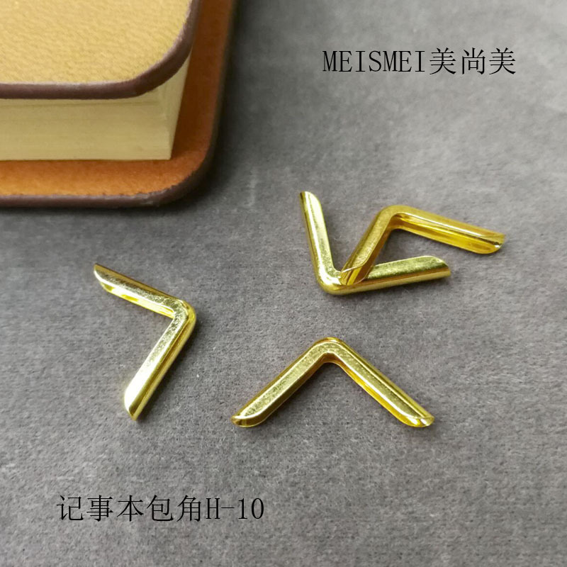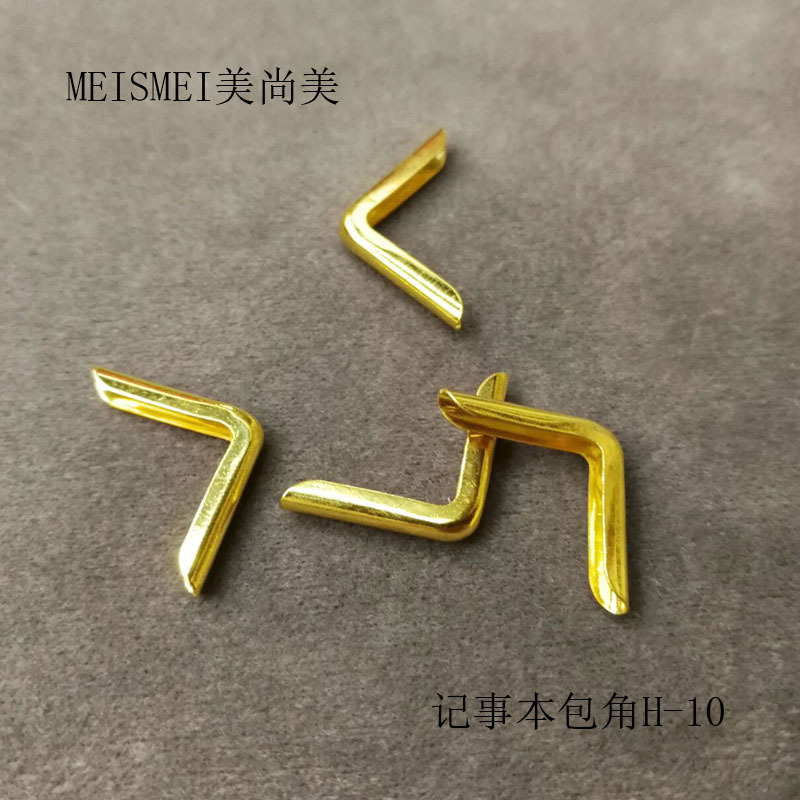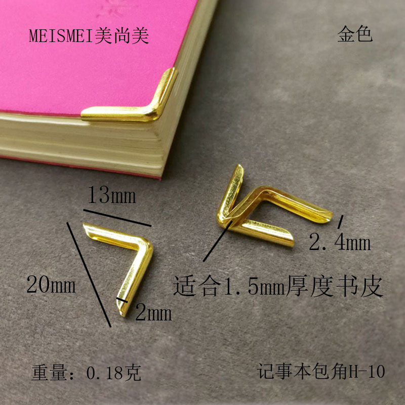 产品型号:记事本包角H-10 产品尺寸:长13mm宽20mm高2.4mm 产品说明:适合1.5mm厚度书皮 产品材料:铁 产品颜色:镀金色 产品重量:0.18克