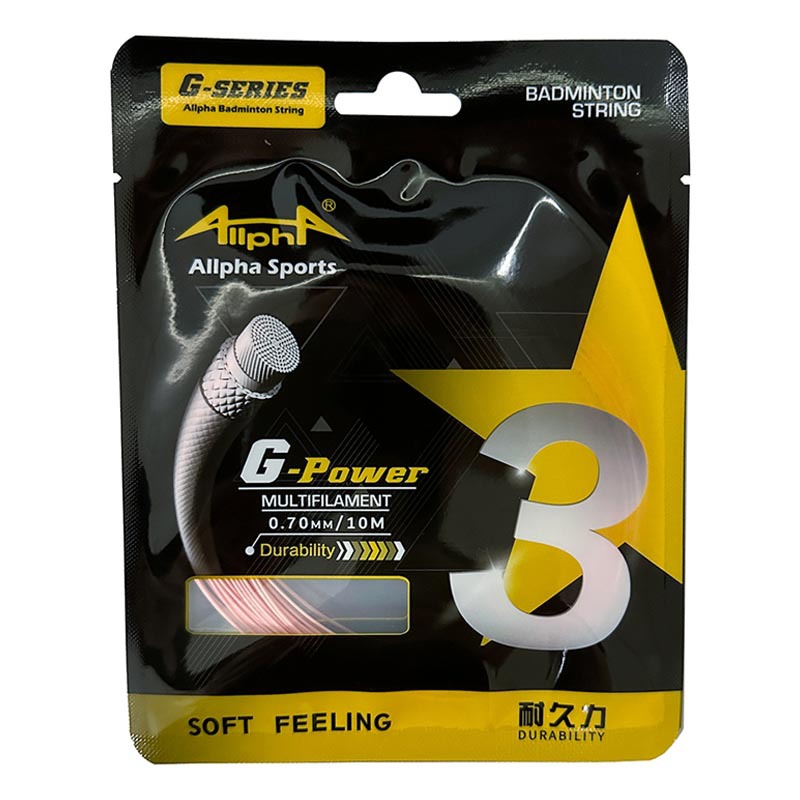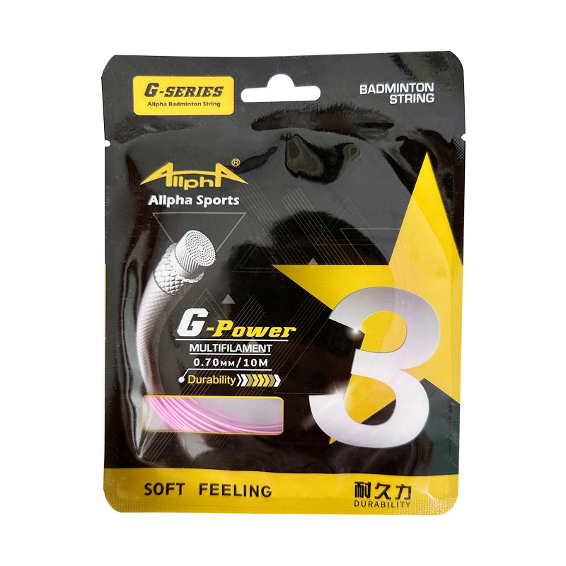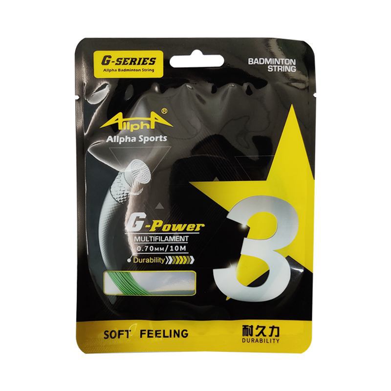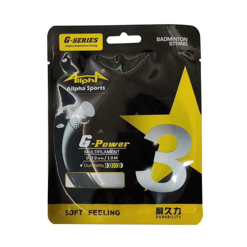 The Allpha G-Power3 is a standard badminton string for foreign trade and exports. The string has a thickness of 0.70mm and a length of 10 meters, making it suitable for one badminton racket. It is made of nylon polymer material to make the string more durable. With the use of a polymer nylon core and a double-layer braiding of twisted filament, this badminton string has stronger tensile strength, better elasticity, and reduced wear between the racket and the shuttlecock, reducing friction between the string and the racket, making it more suitable for athletes' needs. Moreover, the use of a hot-melt coating makes the string more durable and enhances the feel of the racket and the shuttlecock. The string has wear-resistant properties, allowing it to perform well on the court with clear texture and sound, and overall balanced performance. For high durability, elasticity, and powerful smashes, choose the G-Power3 badminton string.
