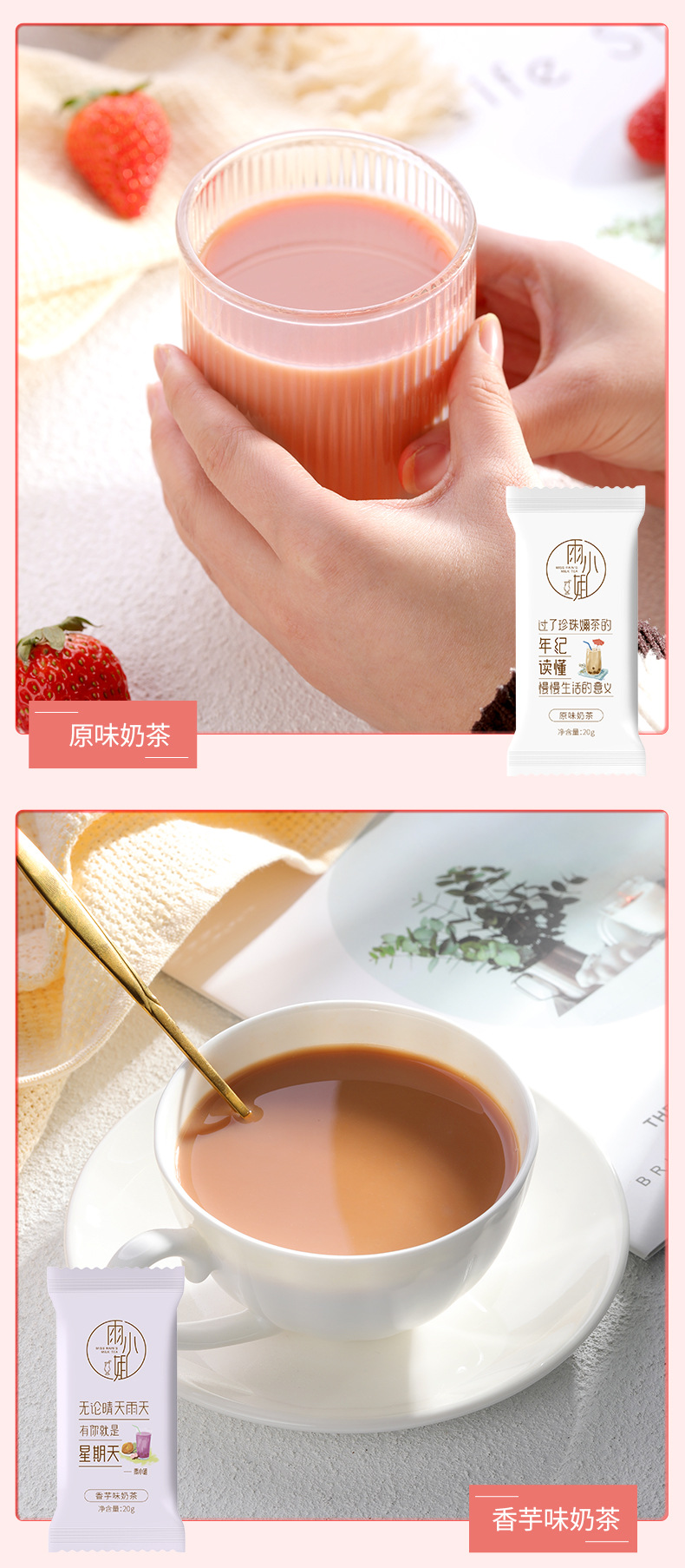 咱们的奶茶属于袋装,每袋约20g左右,冲泡要求:20g奶茶粉冲泡80度左右的热水约140ml。保质期是365天,贮存方法:置于阴凉干燥处