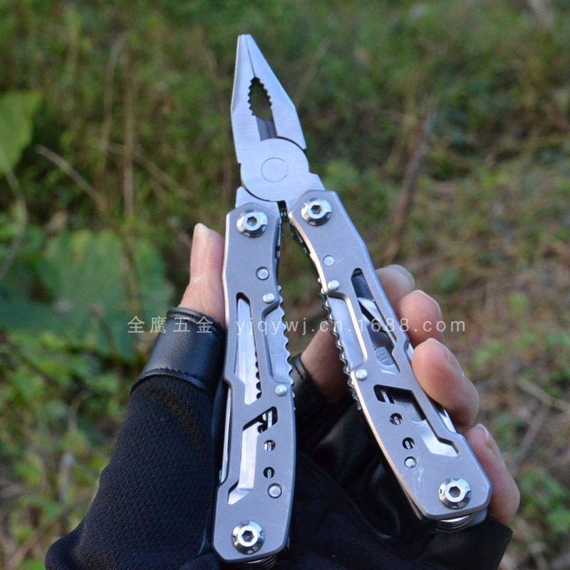 14合一功能:1、钳头(尖嘴钳、圆管钳、剪钳)2、小刀 3、十字螺丝刀 4、小一字螺丝刀 5、鱼鳞牙刀 6、脱钩器 7、双面锉刀 8、大一字螺丝刀 9、小刮刀 10、中一字螺丝刀 11、开罐器 12、开瓶器