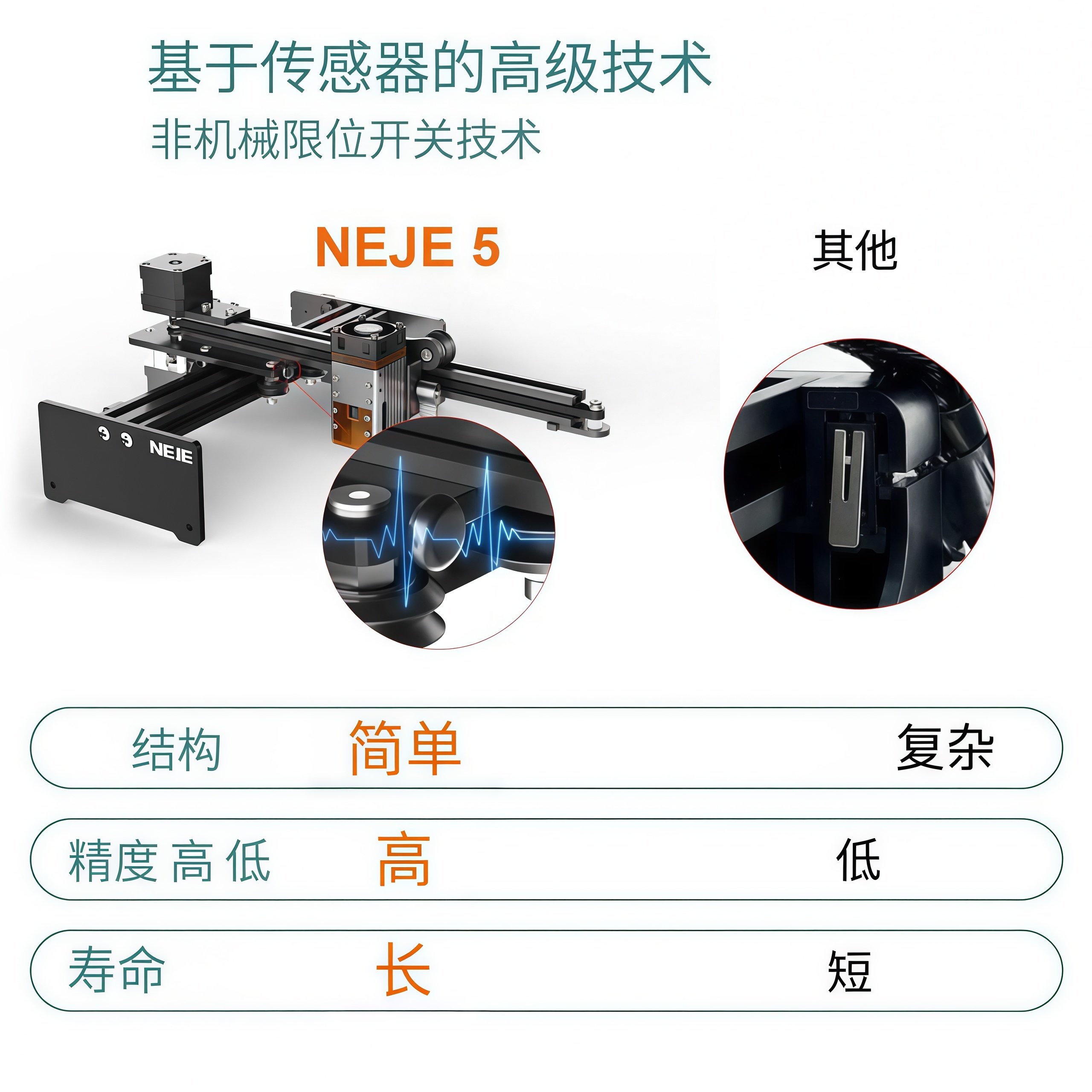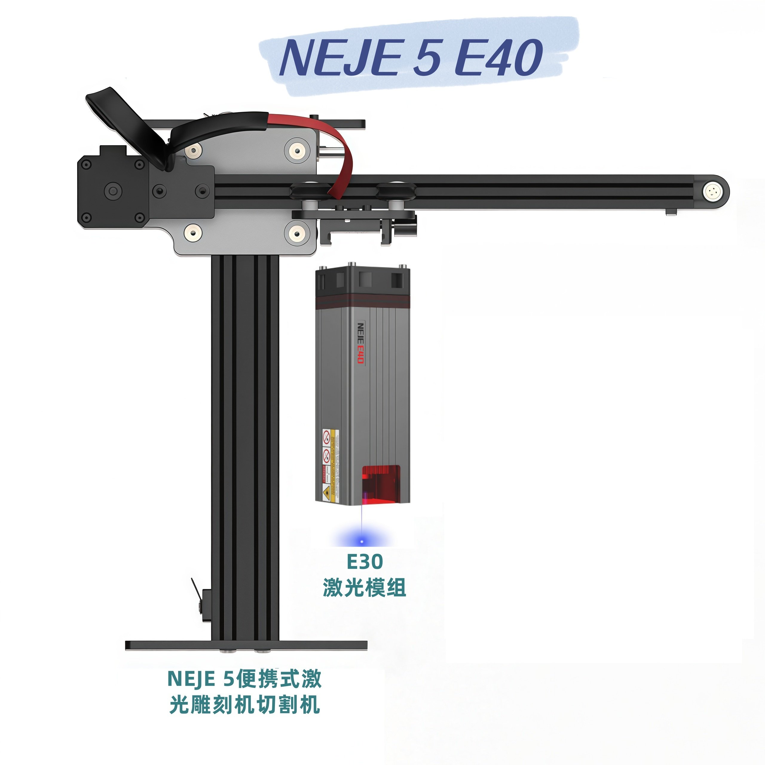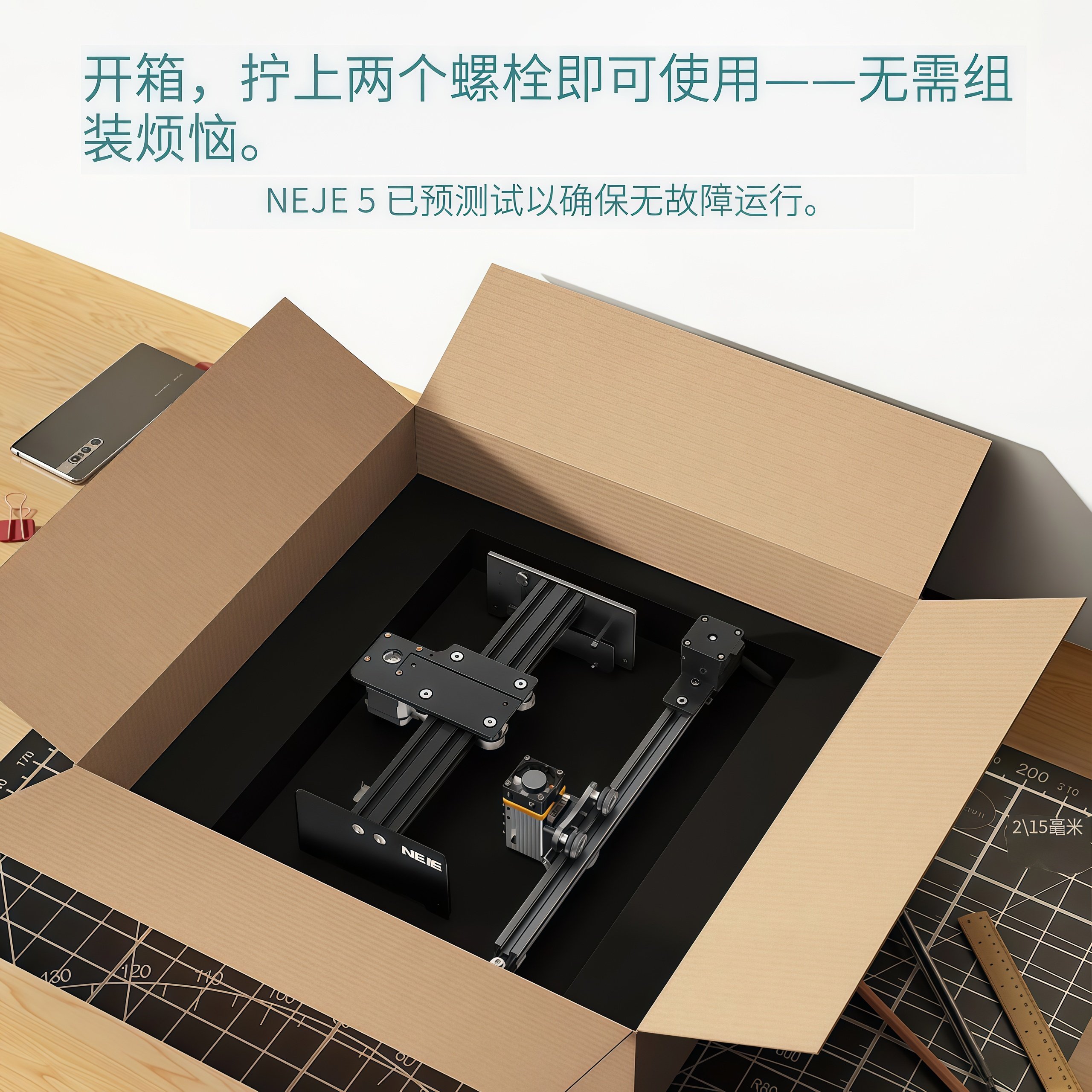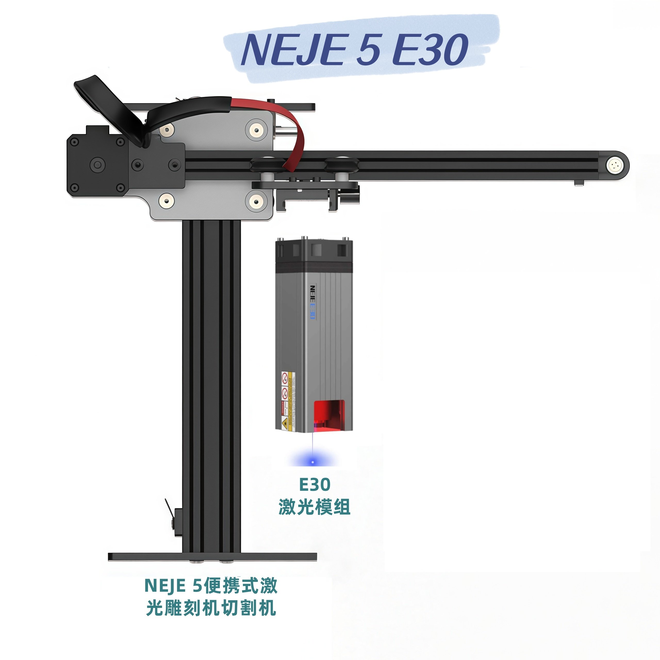 NEJE 5 与 N30820 N30610 B30635 A40630 A40640 E40模块结合使用时,是一款紧凑便携的台式激光雕刻机和切割机,具有出色的雕刻和切割功能。新款 NEJE 5 采用无缝复位技术和更新的控制系统,在与 Lightburn、NEJE 软件、LaserGRBL 等软件以及旋转轴等设备的集成方面取得了重大创新。N30820模块是一个独立的单元,具有镜头保护和可调焦距,使用配备 FAC 光学压缩技术的顶级 Nichia 模块。它具有智能风扇速度控制功能,可实现更安静的运行,低光定位功能,便于操作,以及免维护的针管高压气体辅助功能。