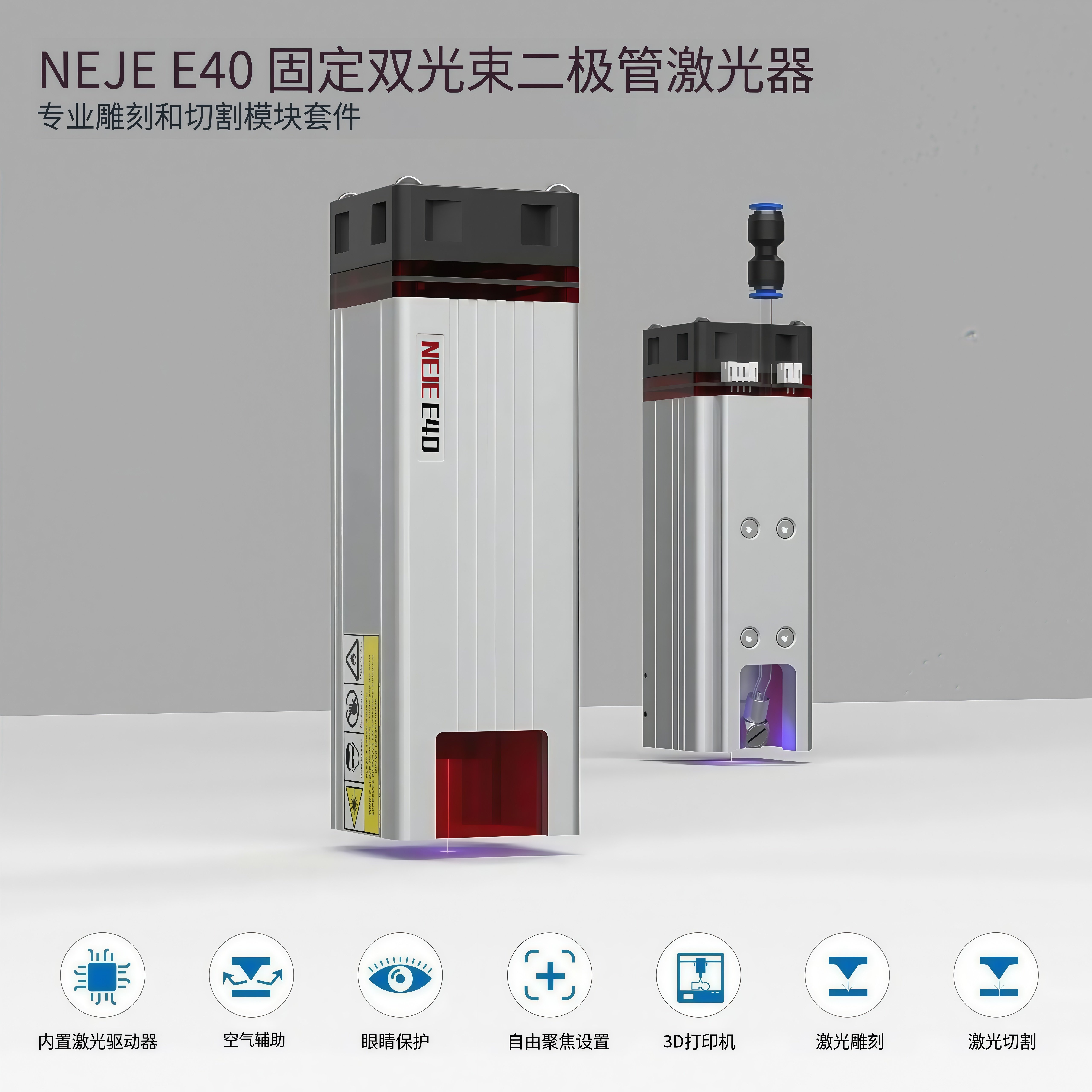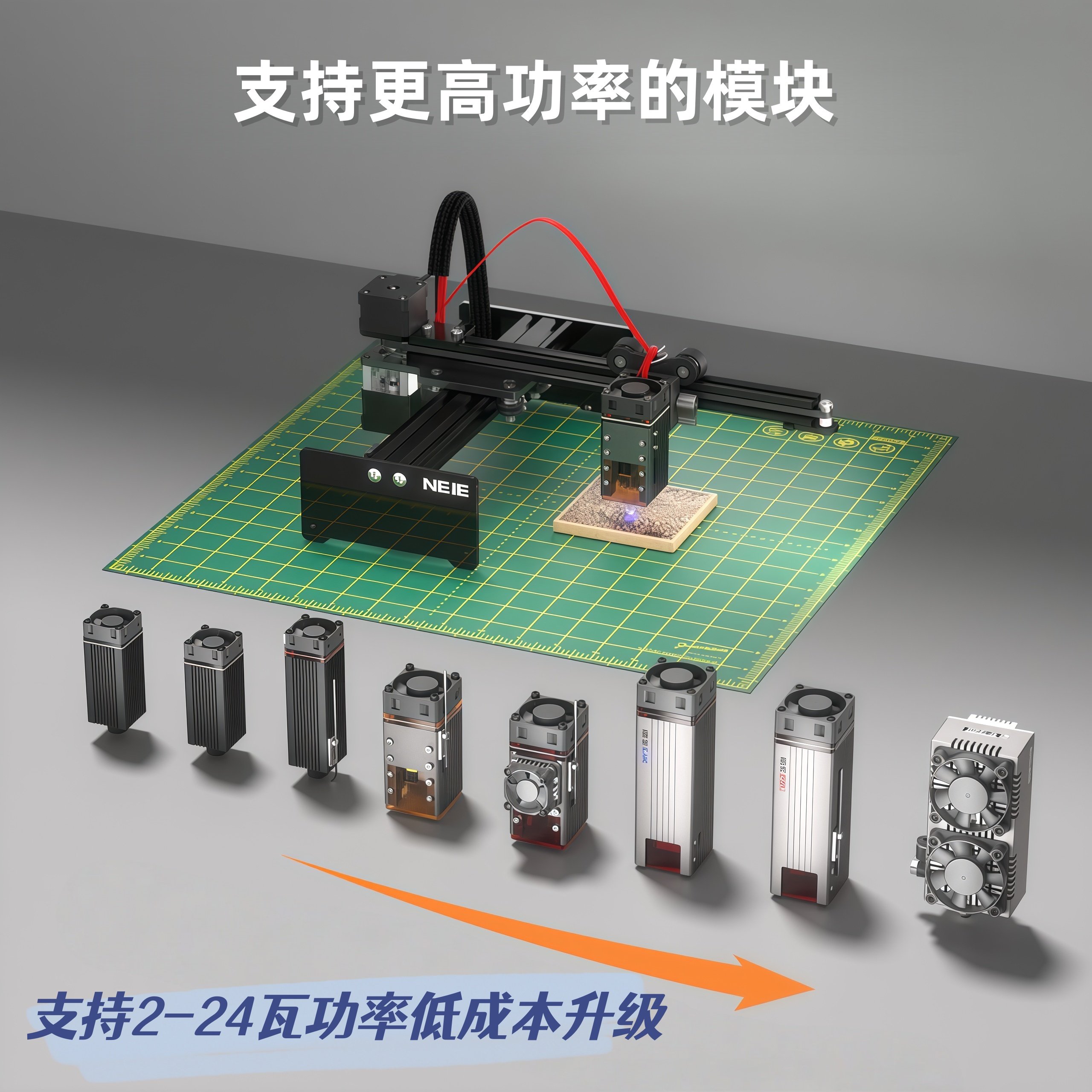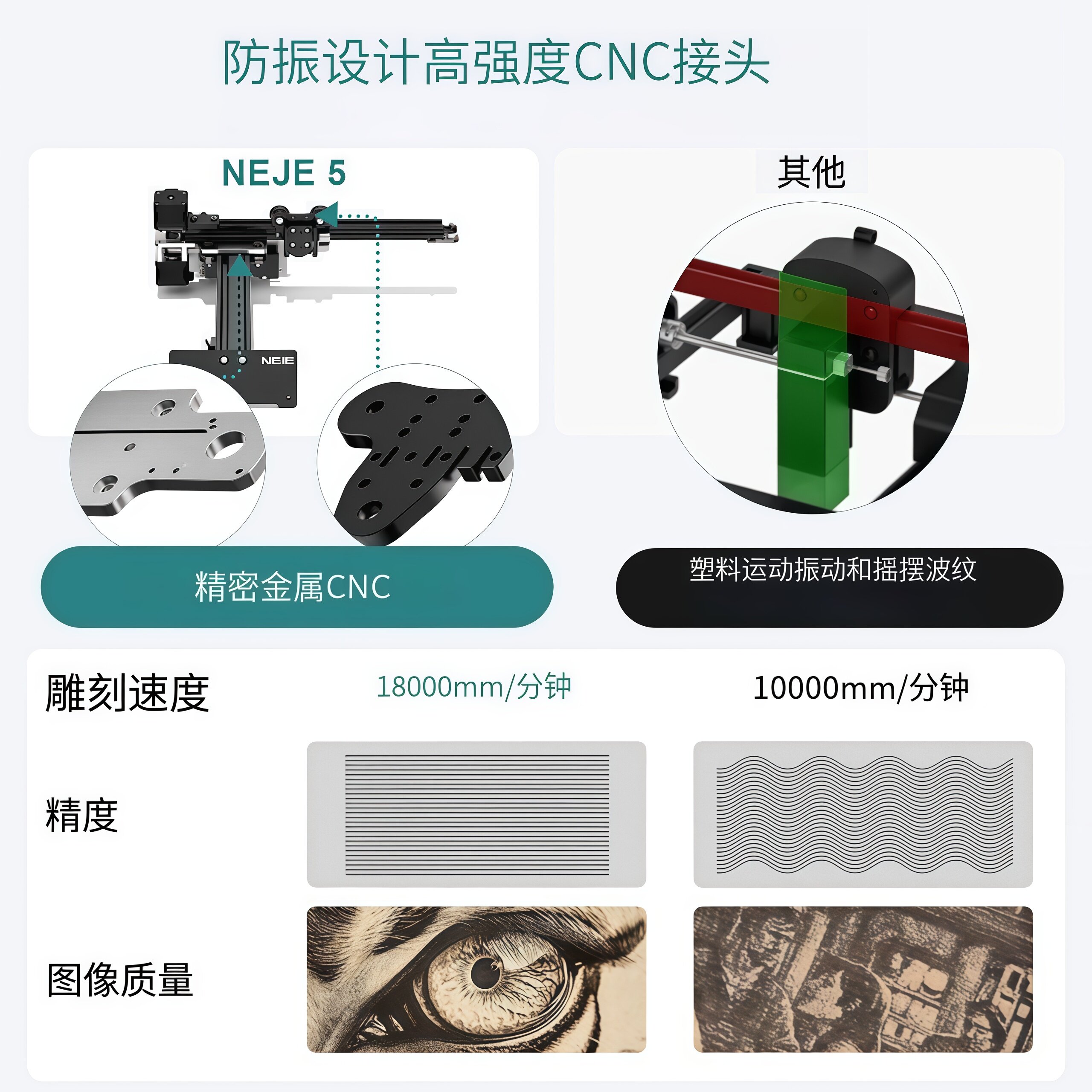 NEJE 5 与 N30820 N30610 B30635 A40630 A40640 E40模块结合使用时,是一款紧凑便携的台式激光雕刻机和切割机,具有出色的雕刻和切割功能。新款 NEJE 5 采用无缝复位技术和更新的控制系统,在与 Lightburn、NEJE 软件、LaserGRBL 等软件以及旋转轴等设备的集成方面取得了重大创新。N30820模块是一个独立的单元,具有镜头保护和可调焦距,使用配备 FAC 光学压缩技术的顶级 Nichia 模块。它具有智能风扇速度控制功能,可实现更安静的运行,低光定位功能,便于操作,以及免维护的针管高压气体辅助功能。