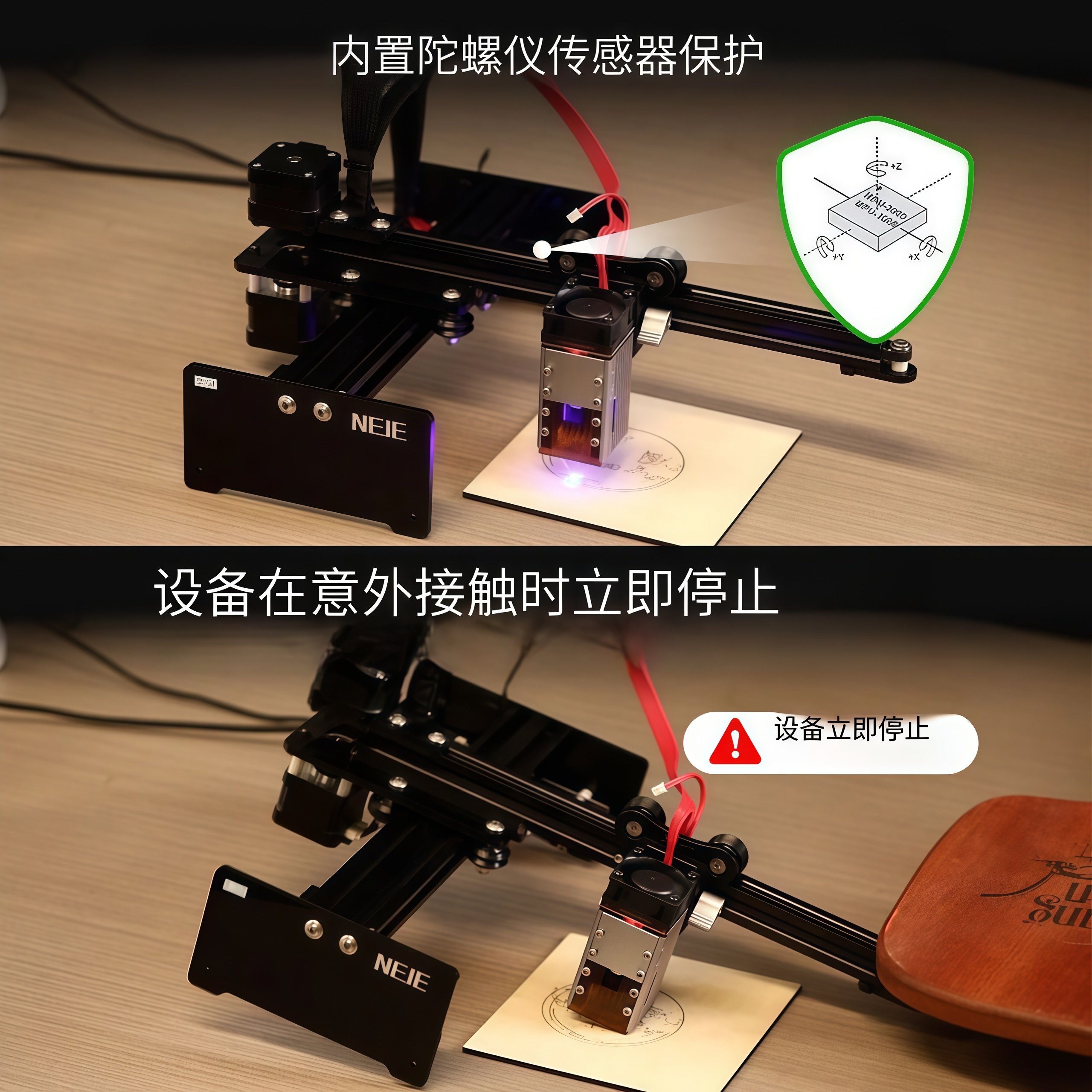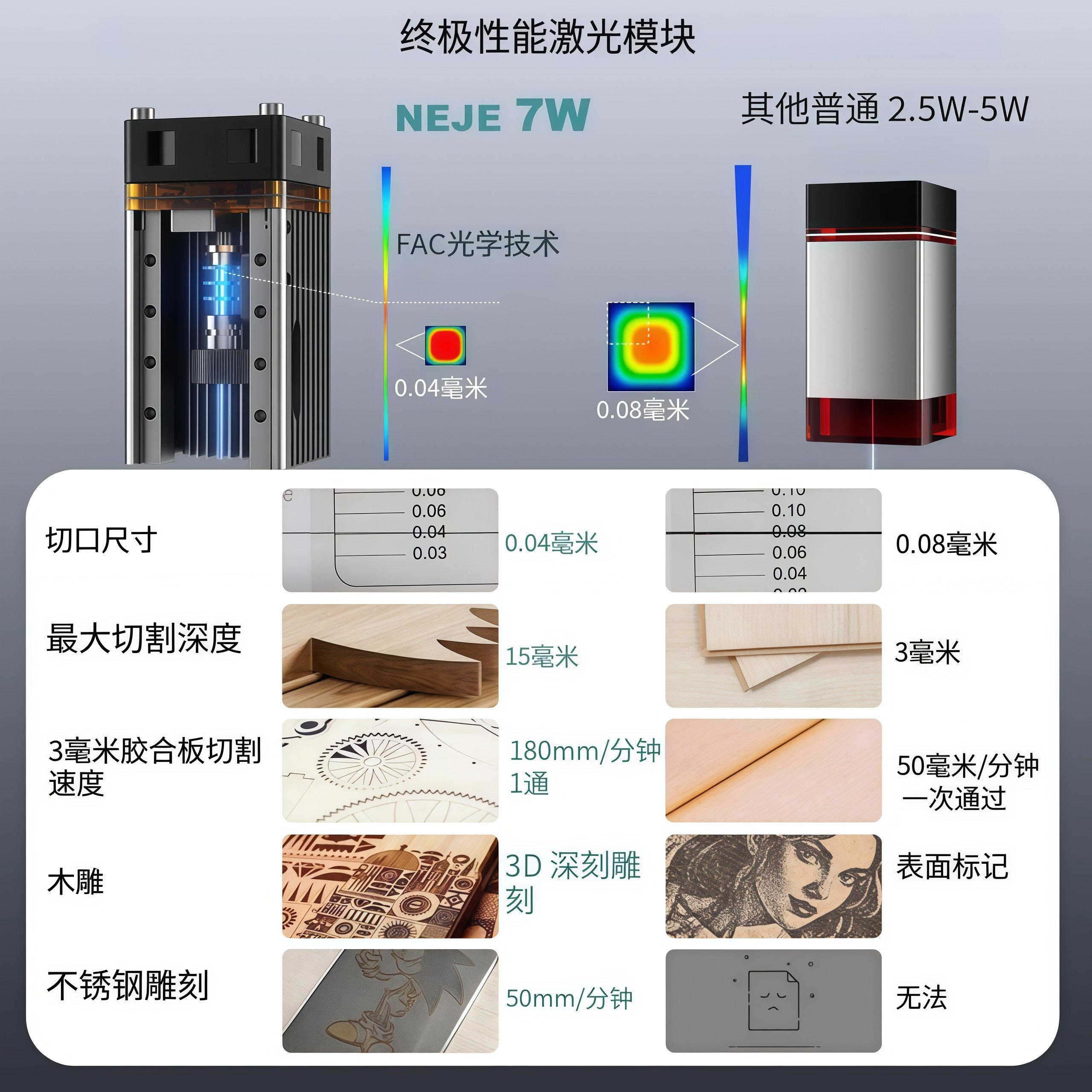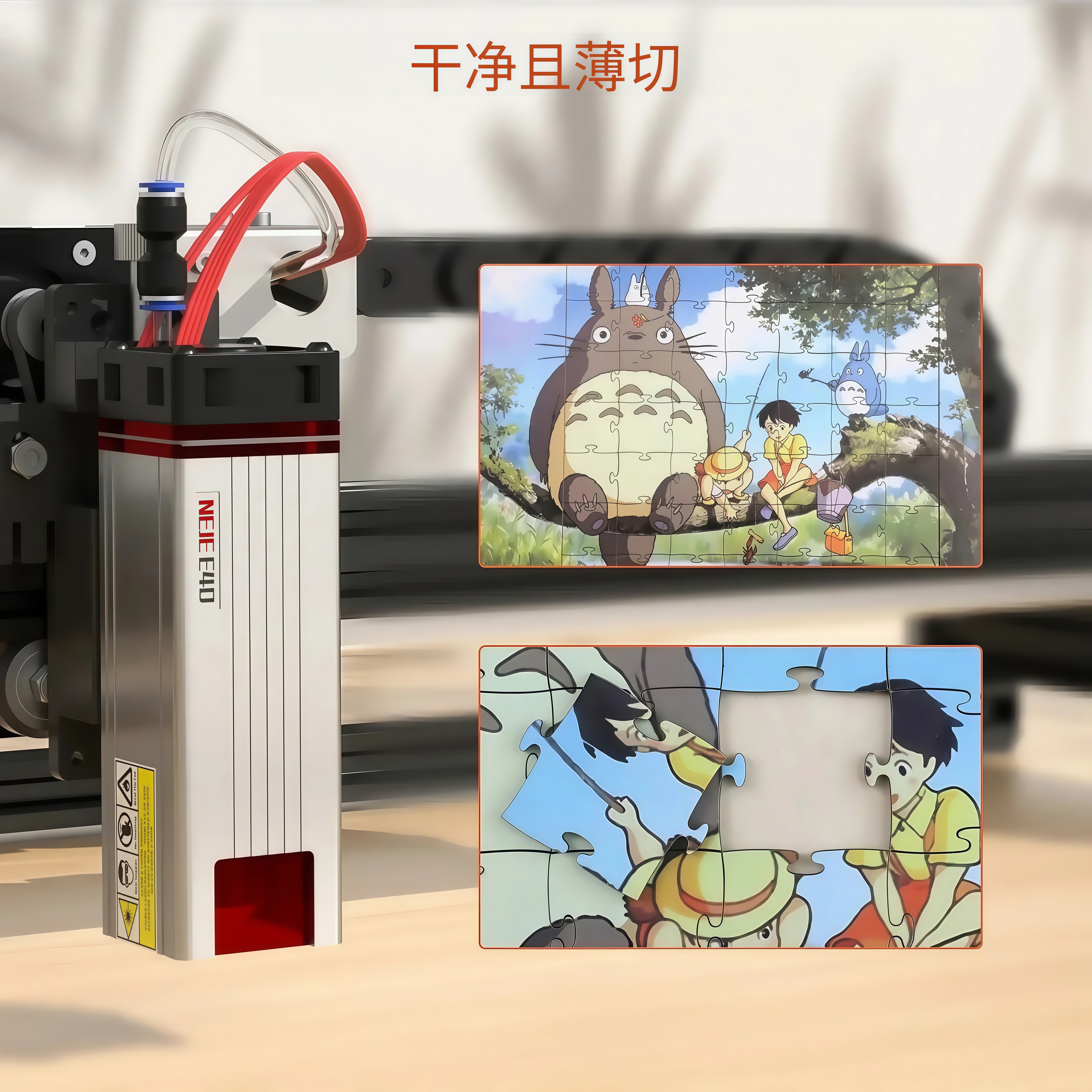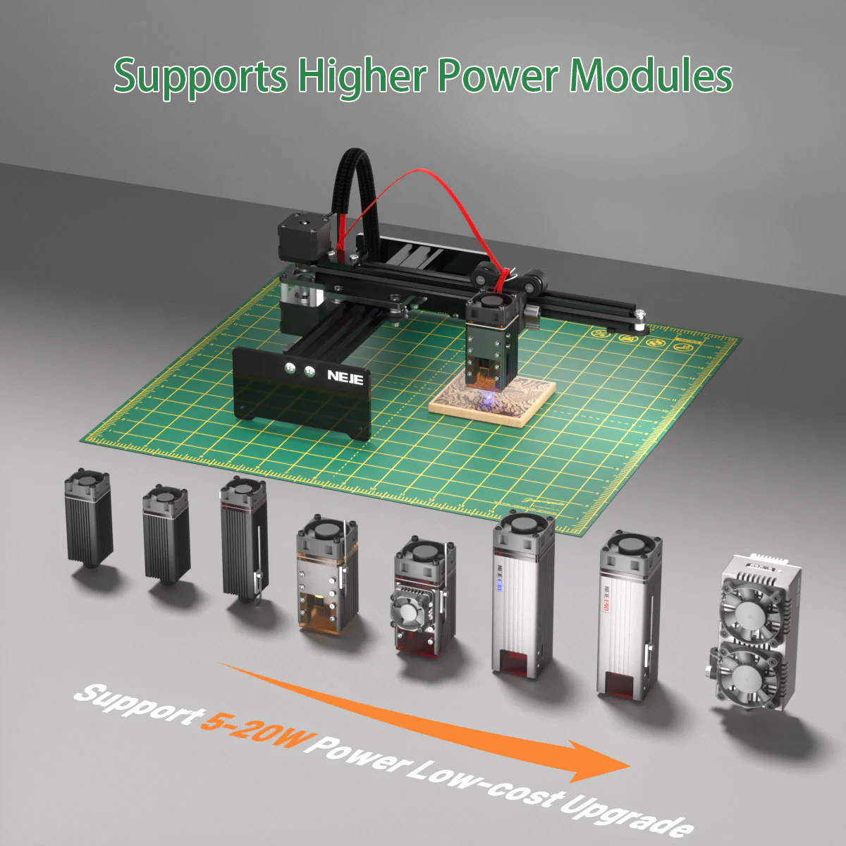 NEJE 5 与 N30820 N30610 B30635 A40630 A40640 E40模块结合使用时,是一款紧凑便携的台式激光雕刻机和切割机,具有出色的雕刻和切割功能。新款 NEJE 5 采用无缝复位技术和更新的控制系统,在与 Lightburn、NEJE 软件、LaserGRBL 等软件以及旋转轴等设备的集成方面取得了重大创新。N30820模块是一个独立的单元,具有镜头保护和可调焦距,使用配备 FAC 光学压缩技术的顶级 Nichia 模块。它具有智能风扇速度控制功能,可实现更安静的运行,低光定位功能,便于操作,以及免维护的针管高压气体辅助功能。