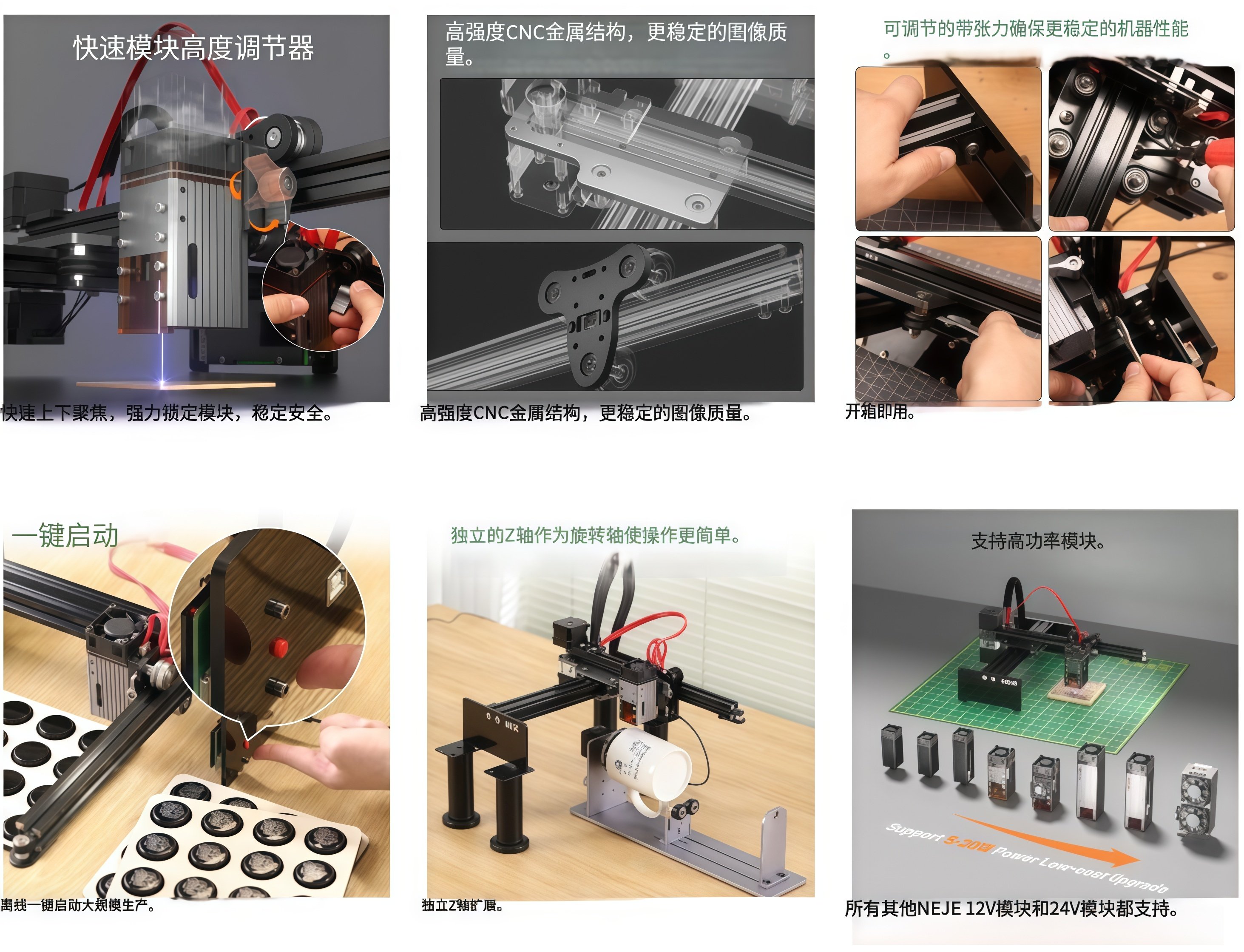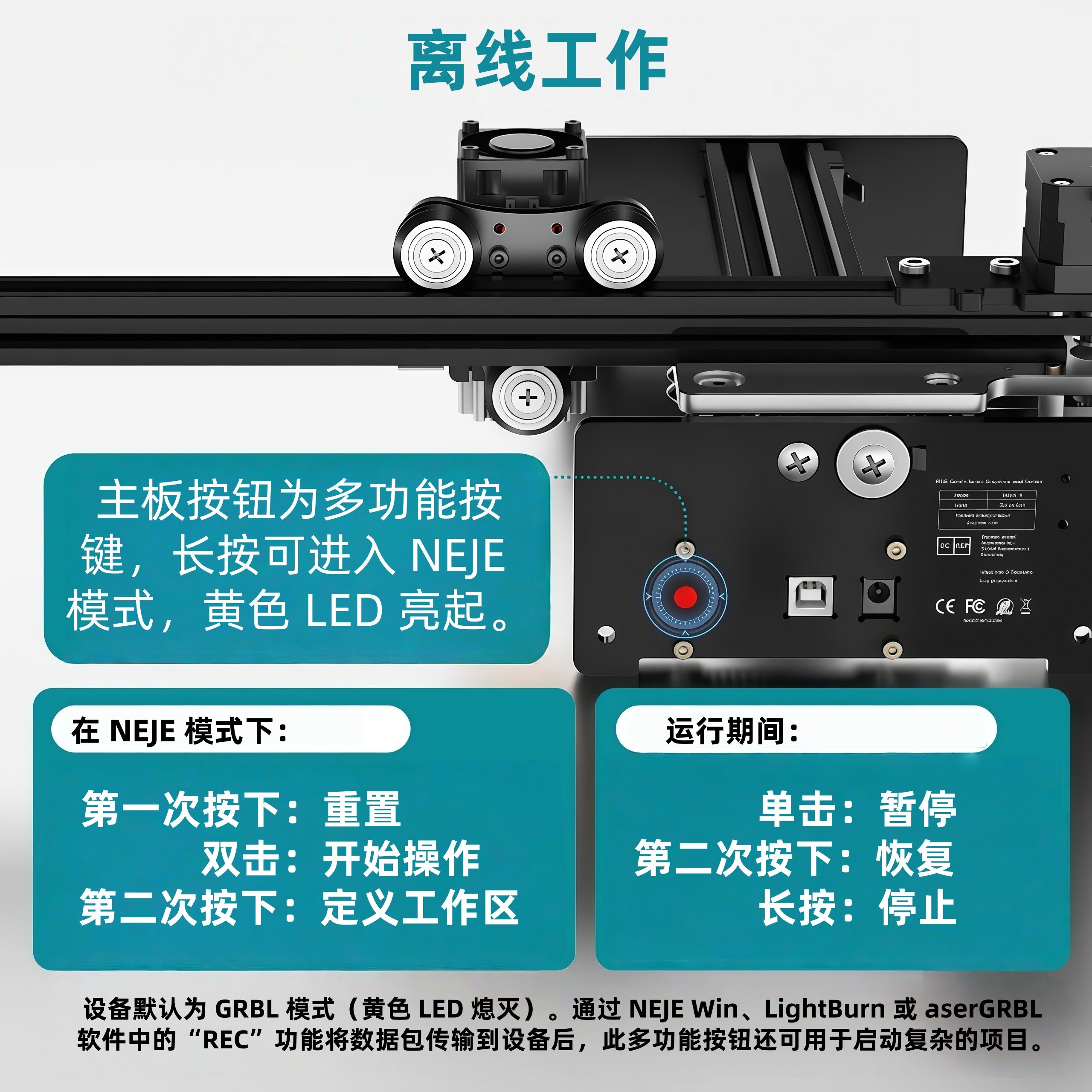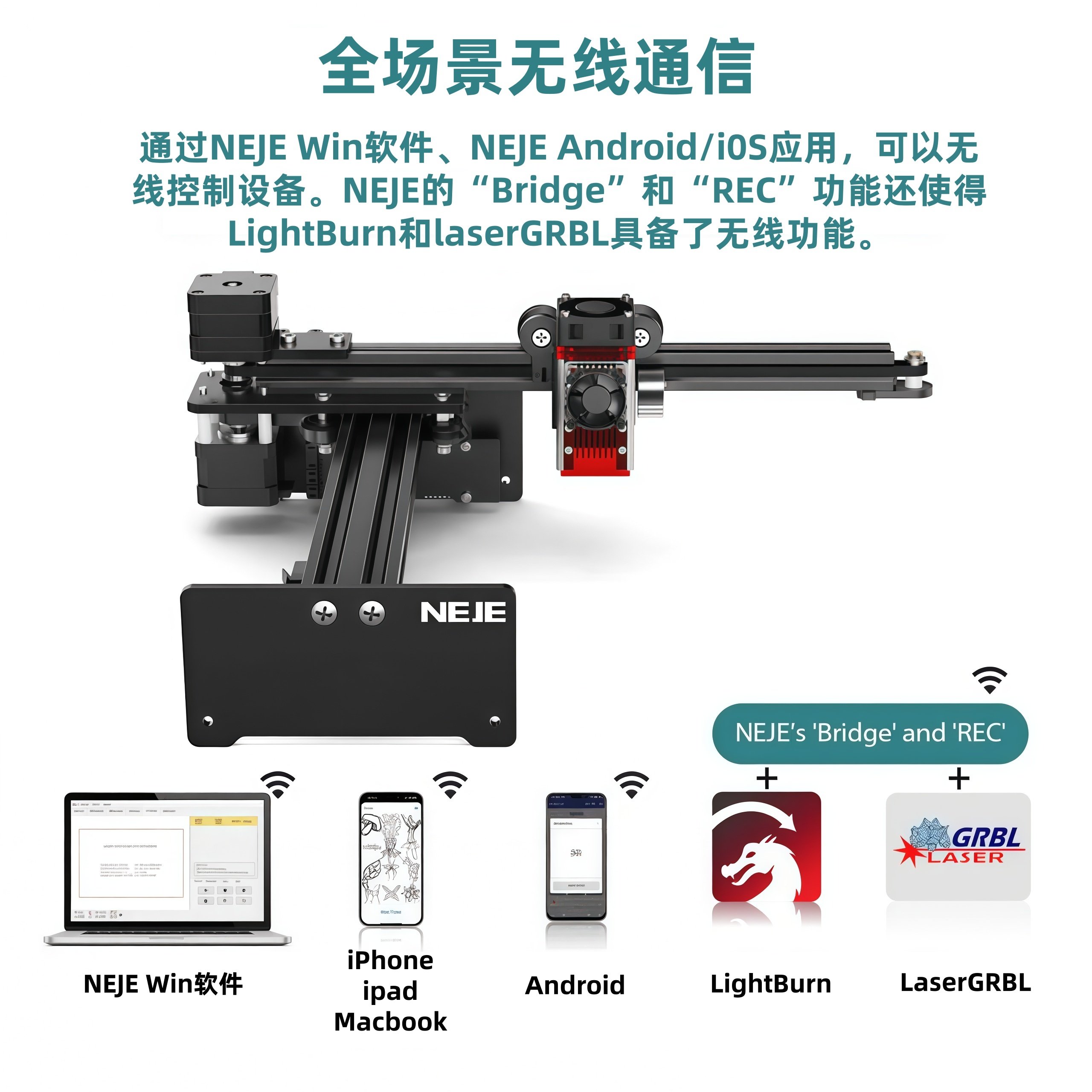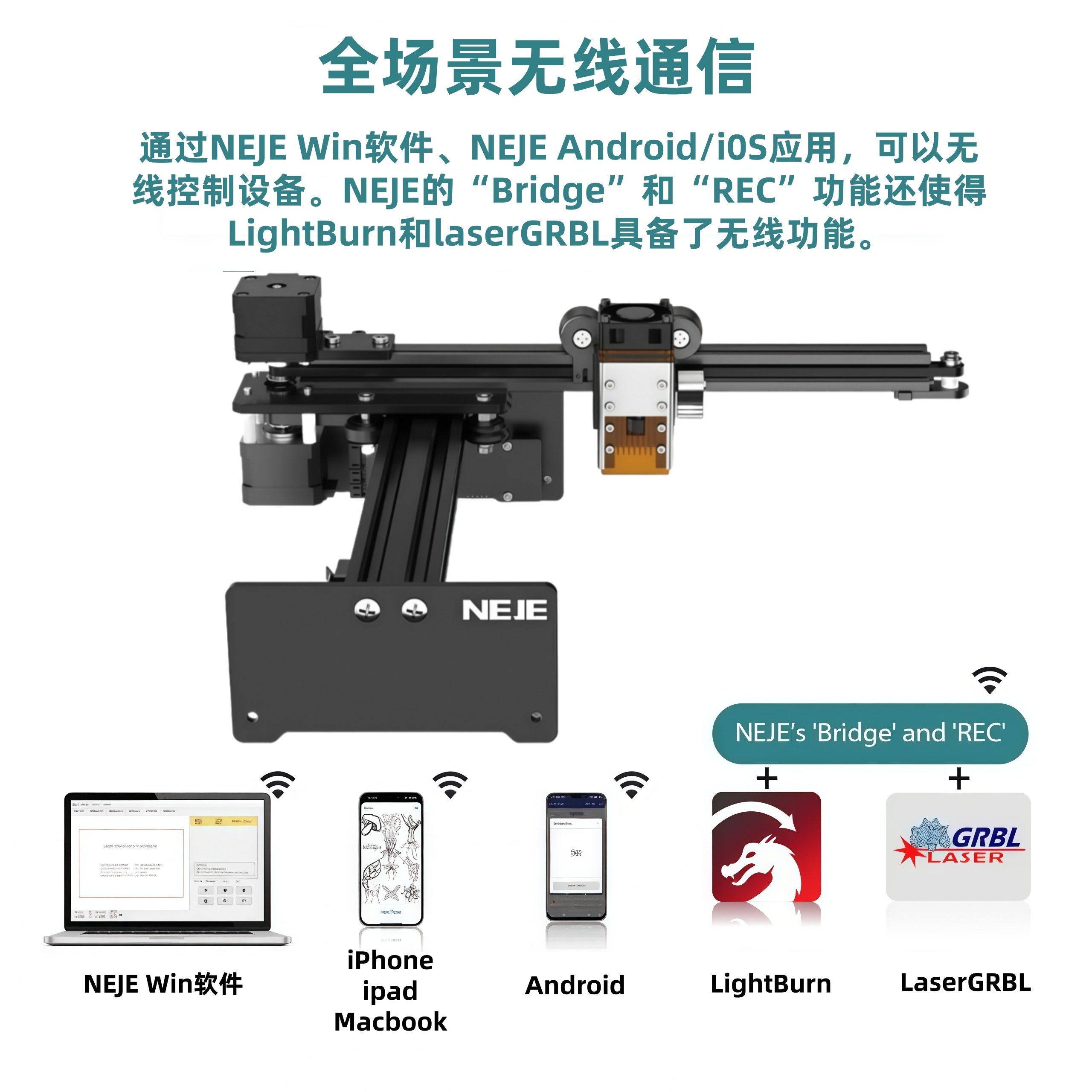 软件与服务:LaserGRBL、LightBurn、NEJE Win Software(专业的多层控制软件,具有NEJE“REC”功能和NEJE“Bridge”功能)NEJE App(Android应用程序,Android手机到PC无线传输工具;iPhone和Mac APP)NEJE Cloud(内容服务平台)NEJE OTA(无线软件和固件更新服务)