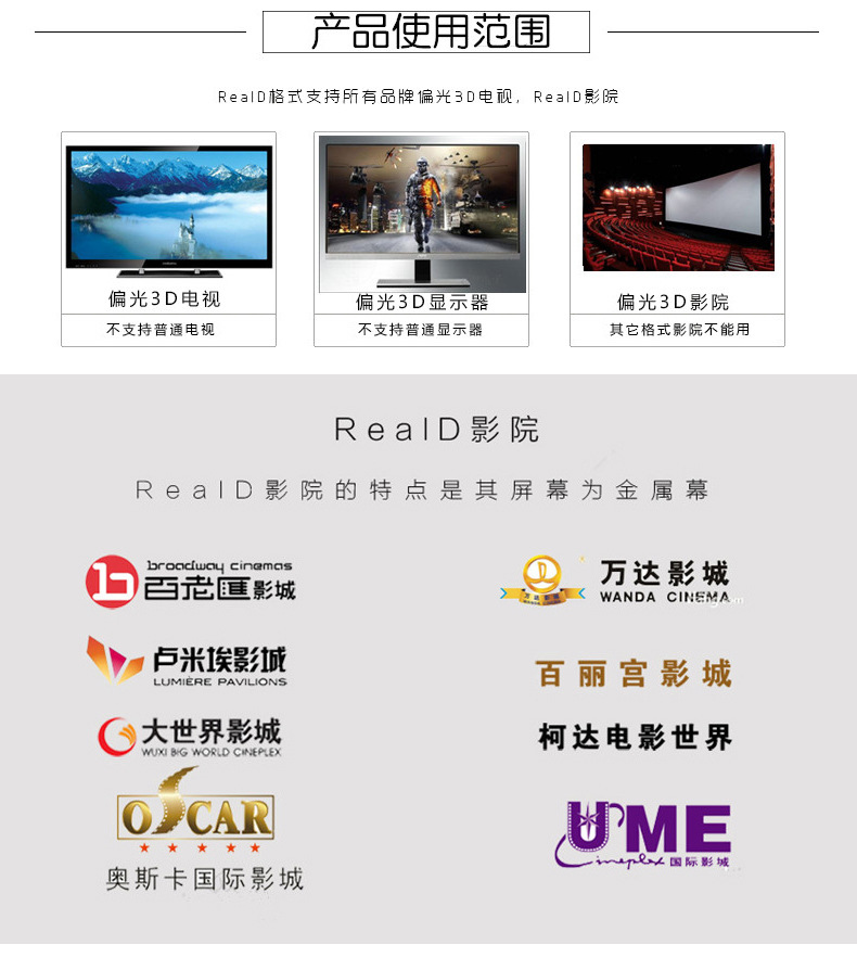 用途:用于观看不闪式3D电视,REALD系统3D影院,偏光式3D电视