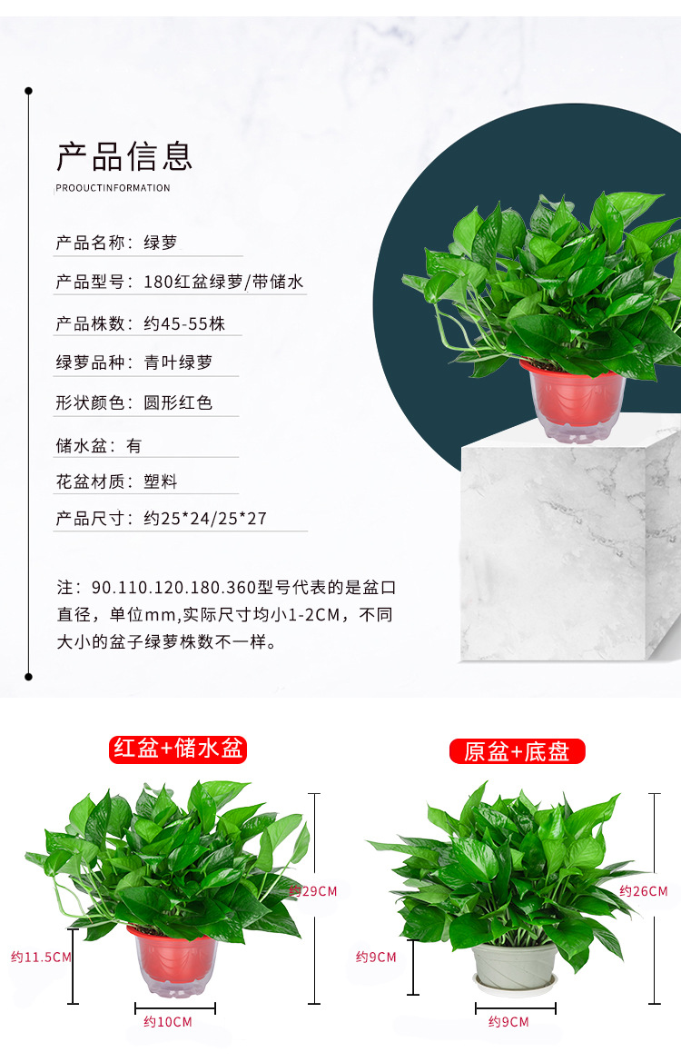 1、180#绿萝规格4盆起批、12盆起批、代表的是起订量,不是盆数量,上面是一盆的单价,不同的起订量价格不一样,后面输入多少盆才是多少盆。(如买8盆,就拍4盆起批的价格拍数量8;买16盆,就拍12盆起批的价格拍数量16,一般左下角会提示下了多少盆,薄利多销,如不按规则下单,我们有权不发货,请谅解)