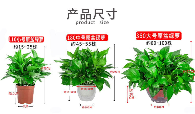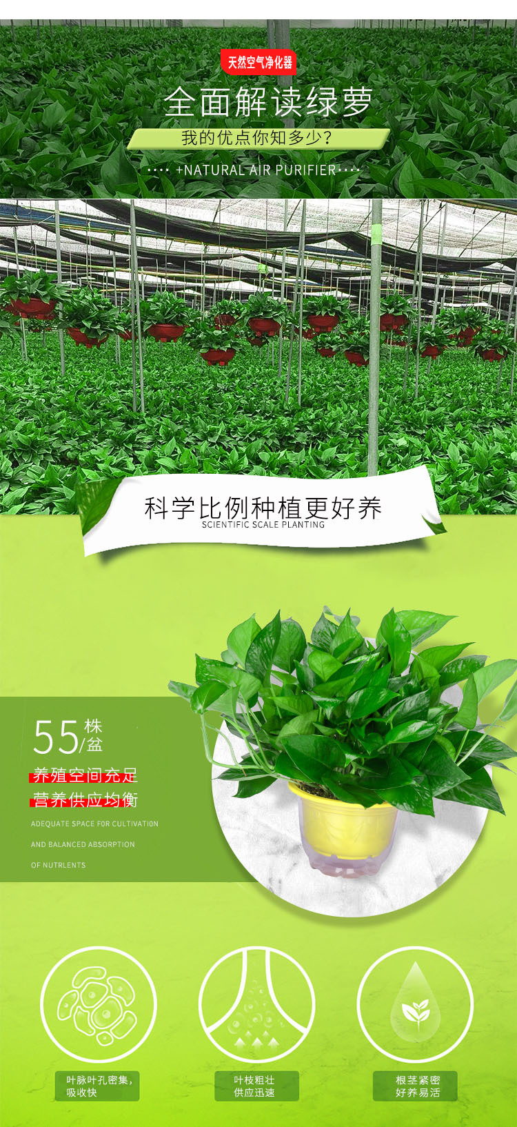 3、根据市场的需求和种植技术受到季节气候温度等因素影响,造成每个阶段每批绿萝可能会有色泽、叶片大小、株高、冠幅的差异,但是保证发出的货品绝对是新鲜的,请允许有这样的误差。(特别是回购客户介意请慎拍)