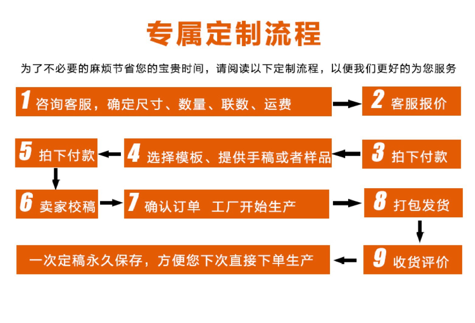 定制产品无法二次销售,请客户一定要仔细核对文字内容及印刷要求,确认无误后方可定稿下单;本厂概不承担因客户内容校对失误而造成的任何损失!下单生产后,不接受任何理由撤单