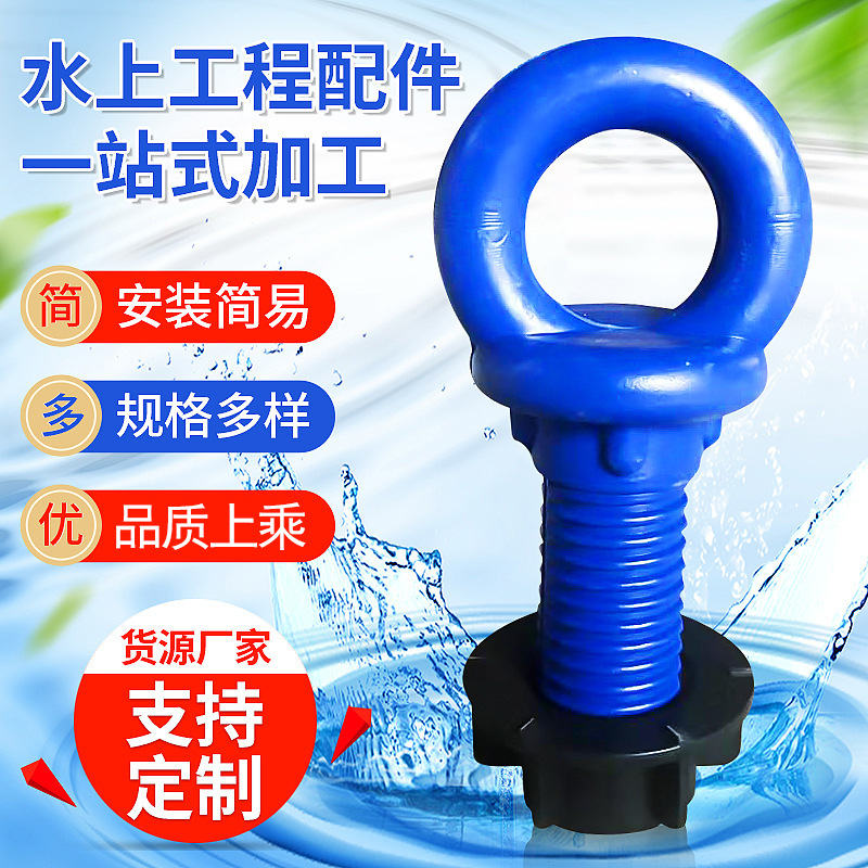 Производитель поставляет пластиковые винтовые комплекты для боковых креплений плавучих понтонов, соединителей для водных платформ и доков, а также подъемных винтов с кольцом.