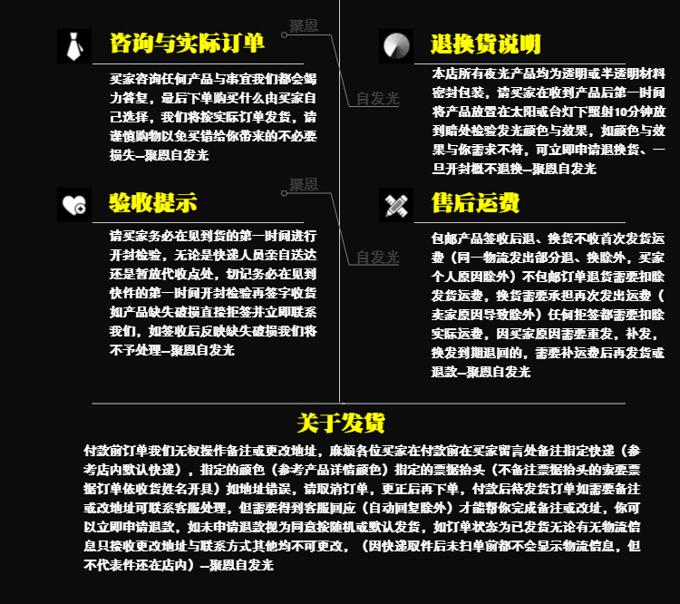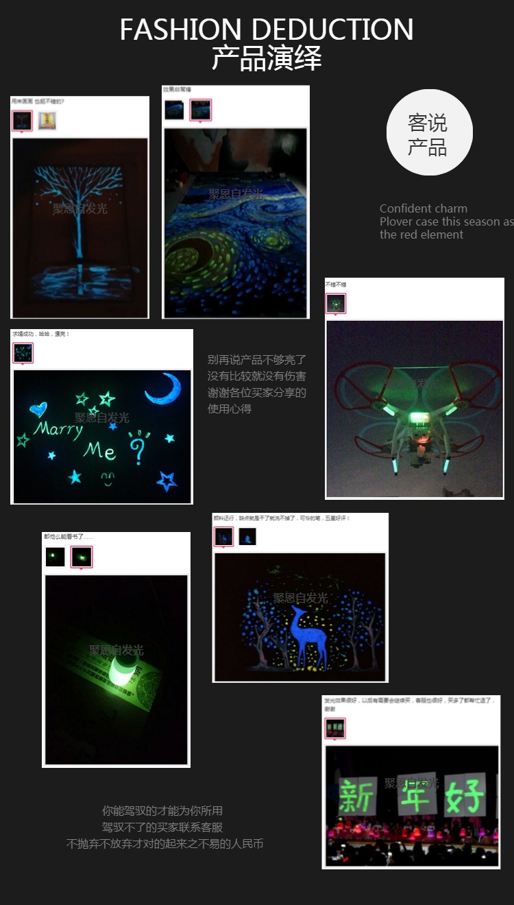 ![]() ![]() ![]() ![]() ![]() ![]() ![]() 可用于彩绘涂鸦、艺术创作、DIY创意礼品、安全防范、广告标示、夜间警示等等。安全环保,可放心使用。如长期室外物体使用或经常性水中浸泡物体用需选购油性夜光漆