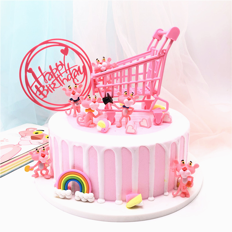 迷你粉色购物车派对少女心蛋糕摆件粉红豹小推车生日蛋糕装饰摆件