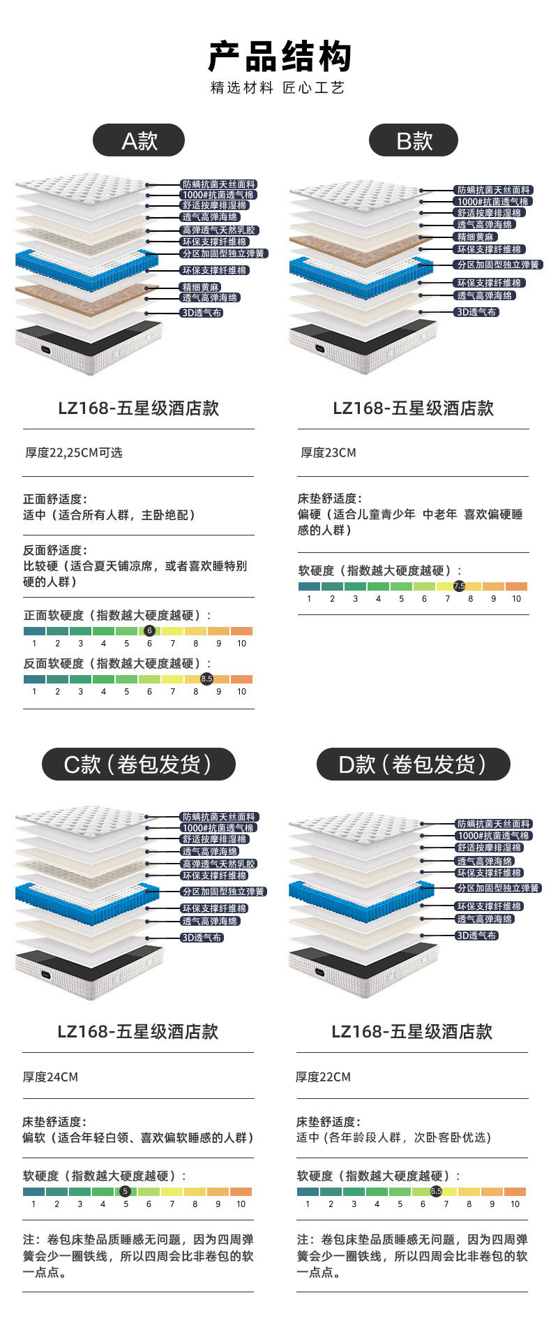 A Мягкая и твердая двойная/независимая сумка Натуральный латексный джут (не рулонная сумка); B твердый/независимый мешок джут (не рулонная сумка); C немного мягче/независимый мешок натуральный латекс (рулонная сумка); D мягкий и жесткий умеренный/независимый мешок экологически чистый хлопок (рулонная сумка)