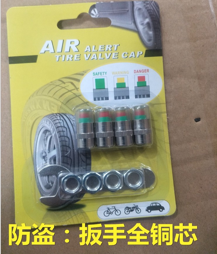 胎压帽是一种针对测量轮胎气压辅助工具,将胎压帽锁固于轮胎气咀之上,直接目视透明盖内的颜色变化来判断轮胎压力是否充足,省去用仪器检测的烦琐!