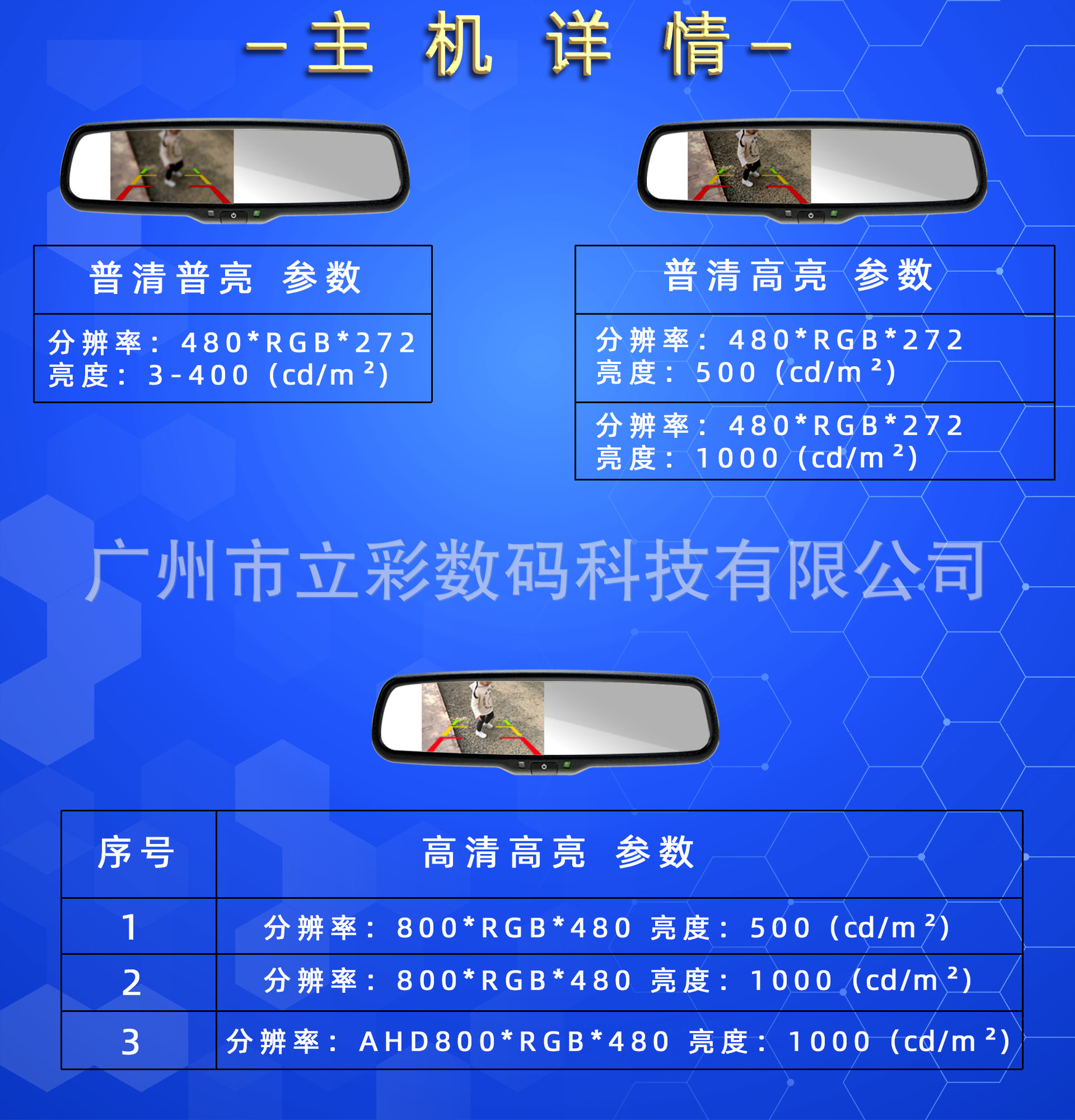 Пу Цин Пу Лян (480*272/3-400CD/м); Изюминка Puqing (480 * RGB * 272/500 кд/м); Выделите Puqing (480 * RGB * 272/1000кд/м); Самое яркое ХД (800 * РГБ * 480/500кд/м); Самое большое ХД (800 * РГБ * 480/1000кд/м); AHD HD Highlight (AHD800 * RGB * 480/1000 кд/м)