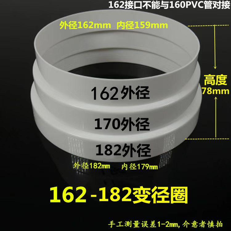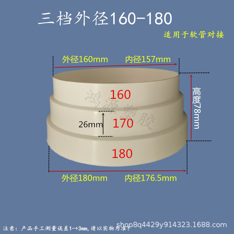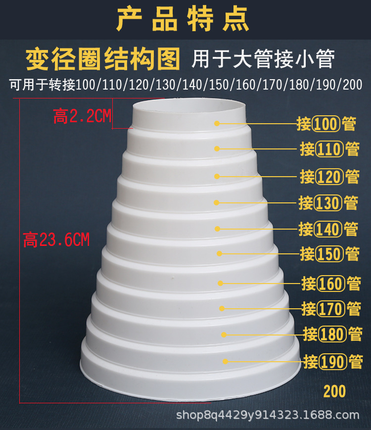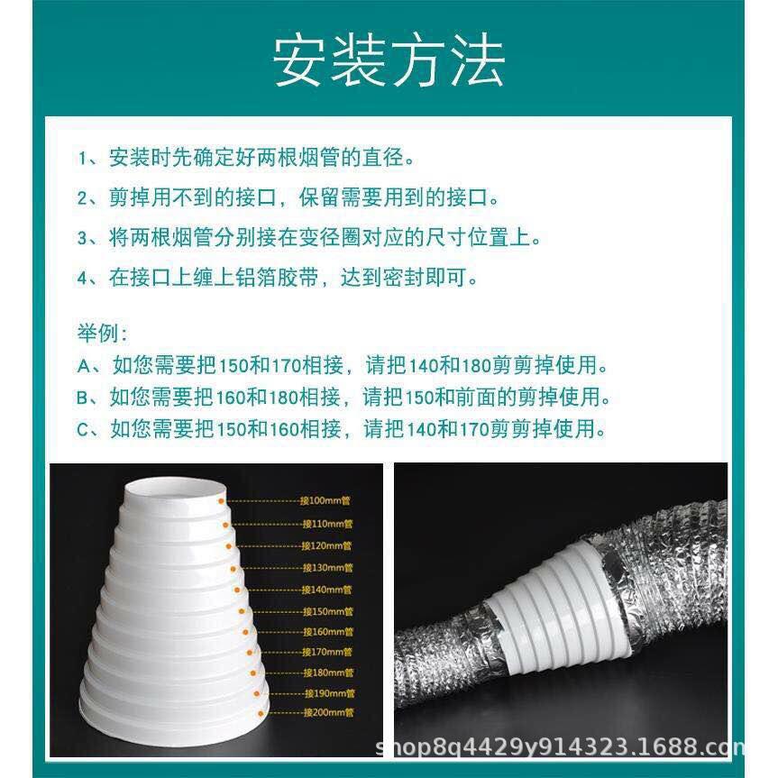 ,采用全新PP料加工而成,韧性好,规格三档外径变径160-180(一件160个)、140-180变径(200个一件)、100-200变径(一件160个)。可以有效解决烟管大小不一样的问题。100-200变径原材料已升级,产品用脚踩都不会裂开,剪刀随意裁剪。