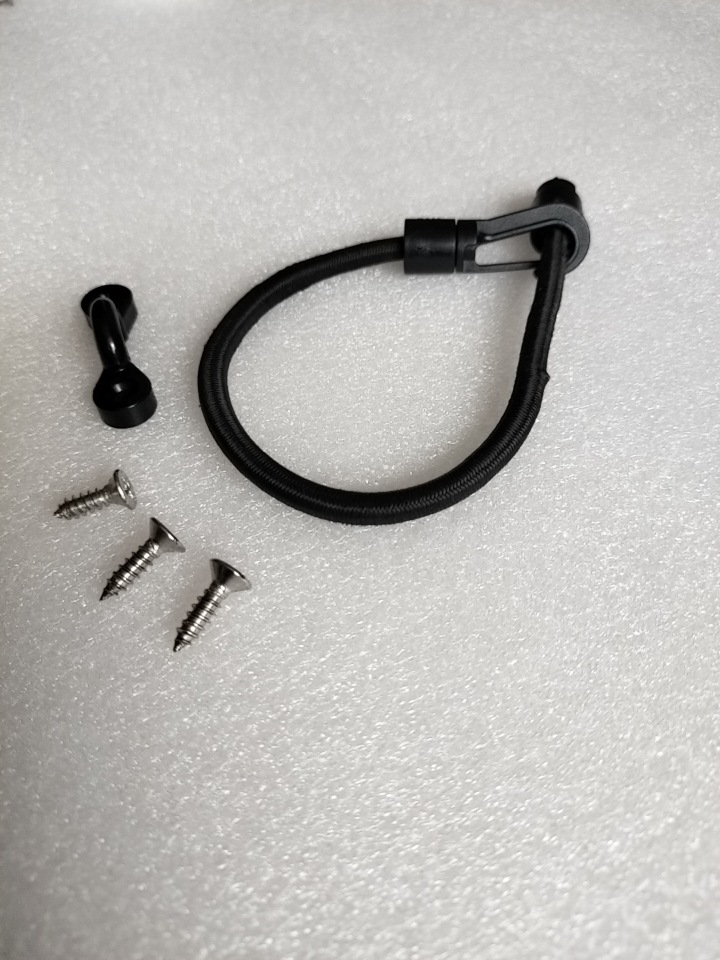 Пластиковая пряжка + саморезы + эластичная веревка.