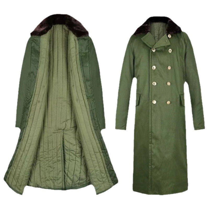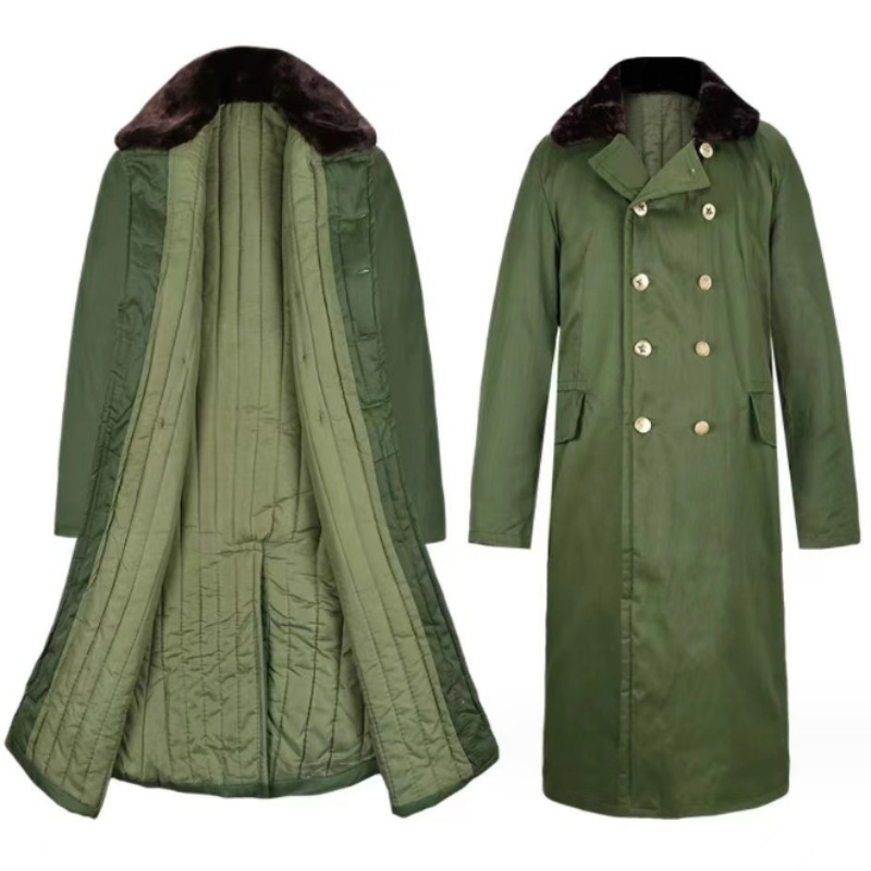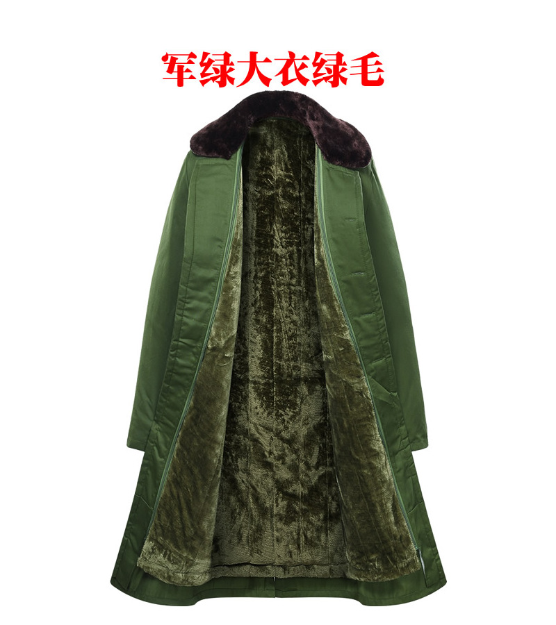 Утолщенная зеленая высококачественная полиэфирная ткань военного цвета, чесаная длинноволокнистым хлопком (средней длины); Утолщенная зеленая высококачественная полиэфирная ткань военного цвета, чесаная длинноволокнистым хлопком (длинный стиль); Черная непромокаемая шелковая ткань с утолщенной бархатной подкладкой (длинный стиль); Зеленая непромокаемая шелковая ткань с утолщенной бархатной подкладкой (длинный стиль); Обычное военное зеленое пальто (длинный стиль); Утолщенный желтый бархат (съемный) длинный фасон; Утолщенный зеленый бархат (съемный) длинный фасон; Утолщенный белый бархат (съемный) длинный фасон; Утолщенная подкладка из чистого хлопка военного зеленого цвета (длинный стиль)