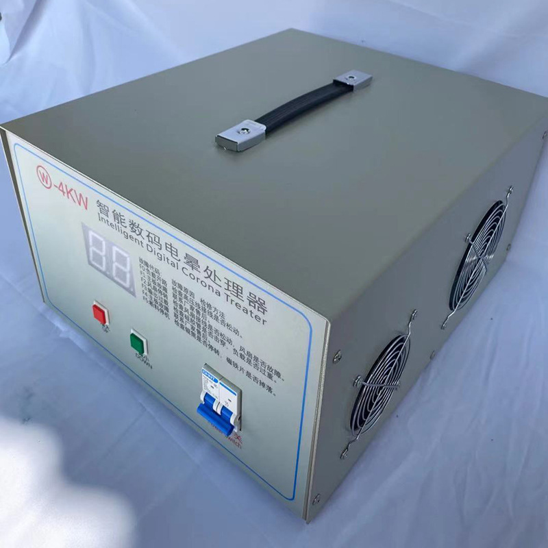 其原理是利用高频率高电压在被处理的塑料表面电晕放电(高频交流电压高达5000-15000V/m2),而产生低温等离子体,使塑料表面产生游离基反应而使聚合物发生交联.表面变粗糙并增加其对极性溶剂的润湿性-这些离子体由电击和渗透进入被印体的表面破坏其分子结构,进而将被处理的表面分子氧化和极化,离子电击侵蚀表面,以致增加承印物表面的附着能力。电晕处理的目的是为了改变许多承印物的表面能量,使之易于同印刷油墨、涂布材料及胶粘剂相粘结。所有承印物在制造过程中进行一些处理之后便具有较好的粘着特性。