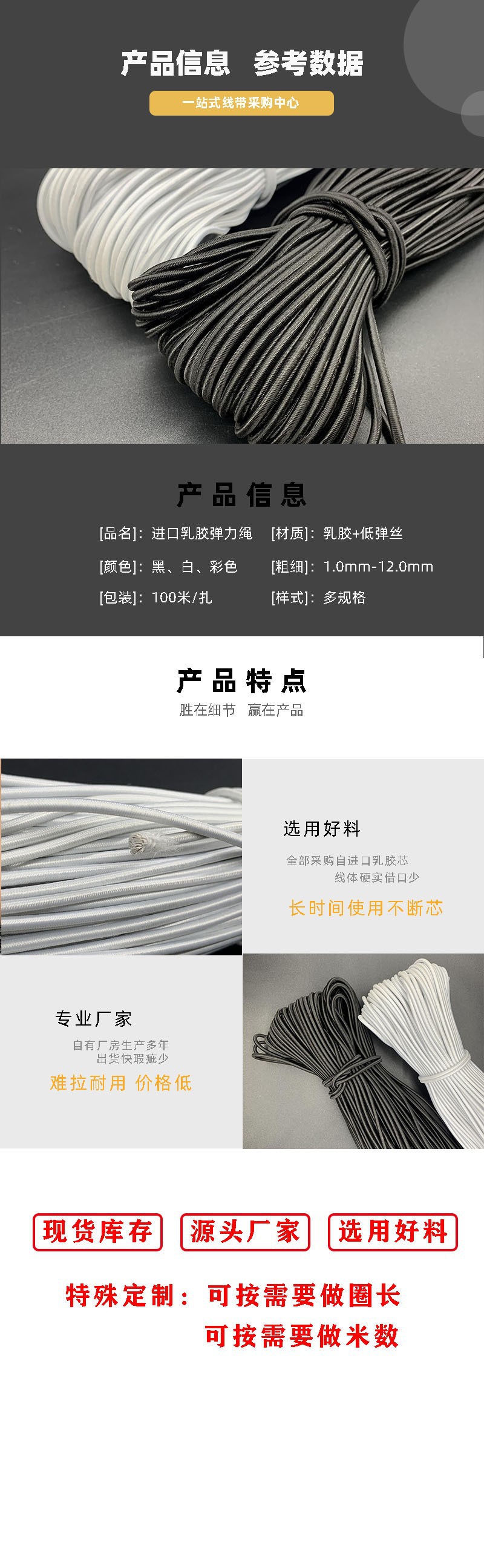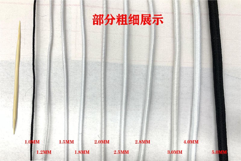 【产品用途】弹力绳的用途非常的广泛!可适用于:带身轻柔薄巧、柔软舒适服帖、拉伸长度大,适用:婴儿、宝宝、老人服装;轻薄款服装;给宝宝做护肚;成人内用的束缚护腰带、装饰小包、服装设计装饰、鞋帽包装设计、手机装饰设计、箱包包装设计、圣诞礼品包装、玩具包装、饰品礼品包装、食品包装设计、公司产品设计包装、化妆品包装、酒盒包装、月饼包装设计等