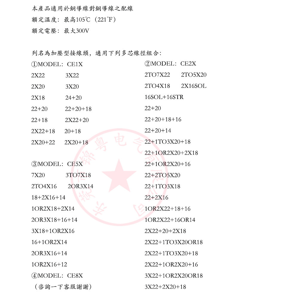 Алюминий CE1 (#22 ~ 18AWG); Алюминий CE2 (#22 ~ 14AWG); Алюминий CE5 (#22 ~ 10AWG); Алюминий CE8 (#16~10 АВГ); Высокая температура CE2 медь