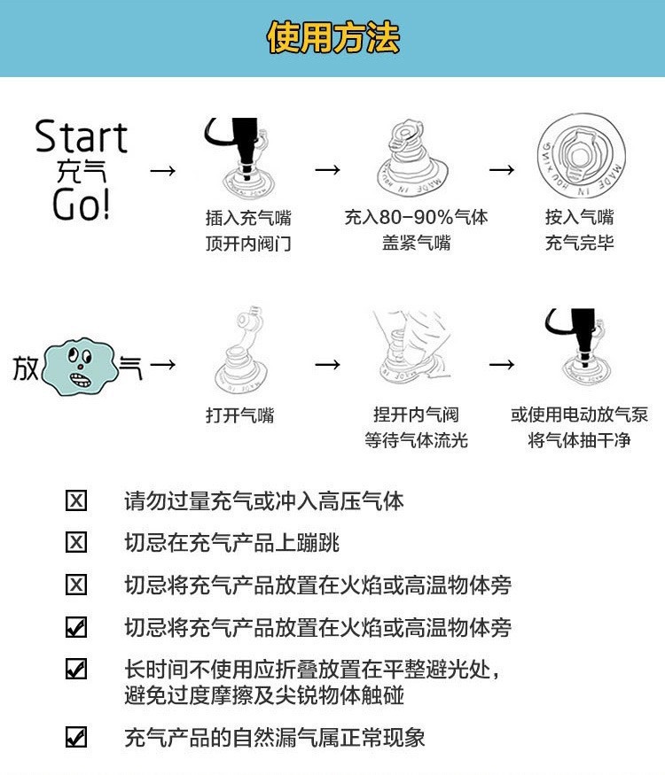 ★使用方便:配置安全充气阀(嘴),一次充饱,可以排气多次使用,持久耐用。