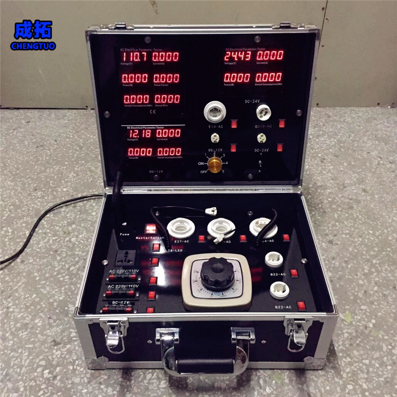 12、测DC12V时,把被测灯具接在标有DC12V的灯座或线夹上,打开电源开关,即可测成品灯参数。DC12V内部开关电源最大功率负载120W。
