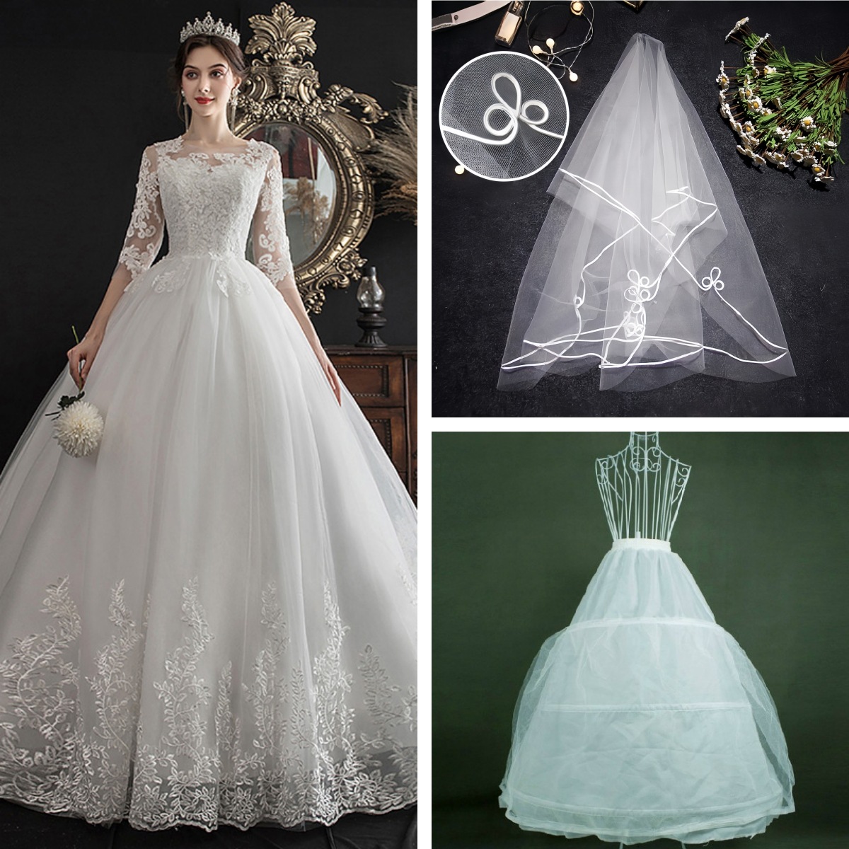 белый; Свадебное платье + (сутушка и вуаль); Свадебное платье + (подъюбник из фатина + фата с краем из нитей); Свадебное платье + комплект аксессуаров из пяти предметов + (трусики и фата); Свадебное платье + пуш-ап бюстгальтер + (трусики и фата)