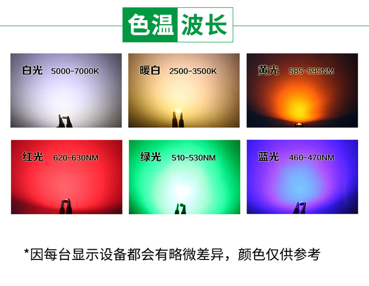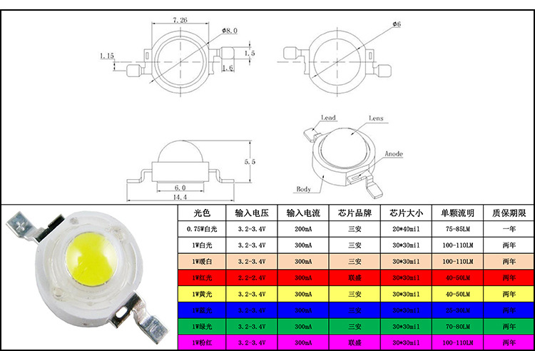 0,75 Вт белый свет; 1 Вт белый свет; Теплый белый 1 Вт; 1 Вт красный свет; 1 Вт желтый свет; 1 Вт синий свет; 1 Вт зеленый свет; 1 Вт розовый; 3WRGB светодиоды