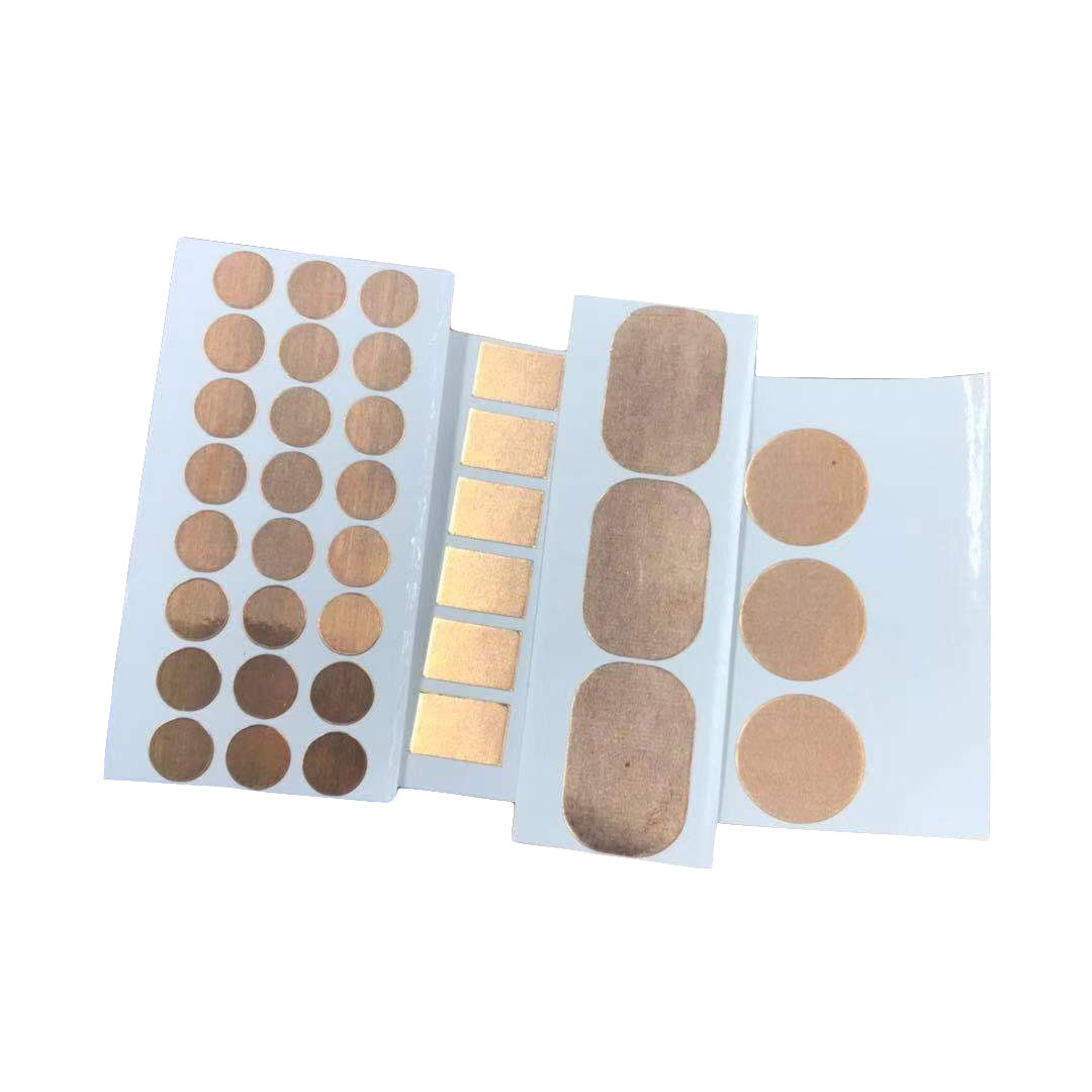 此款自粘铜箔有单面导电和双面导电可供选择,厚度有0.06mm,0.1mm可选。可用于焊线,易操作,不易卷曲。按要求定制尺寸。用于蓝牙耳机触摸按键开关,电子器件触摸形状、电脑周边线材、电脑显示器及变压器制造商。欢迎来电咨询洽谈索样。