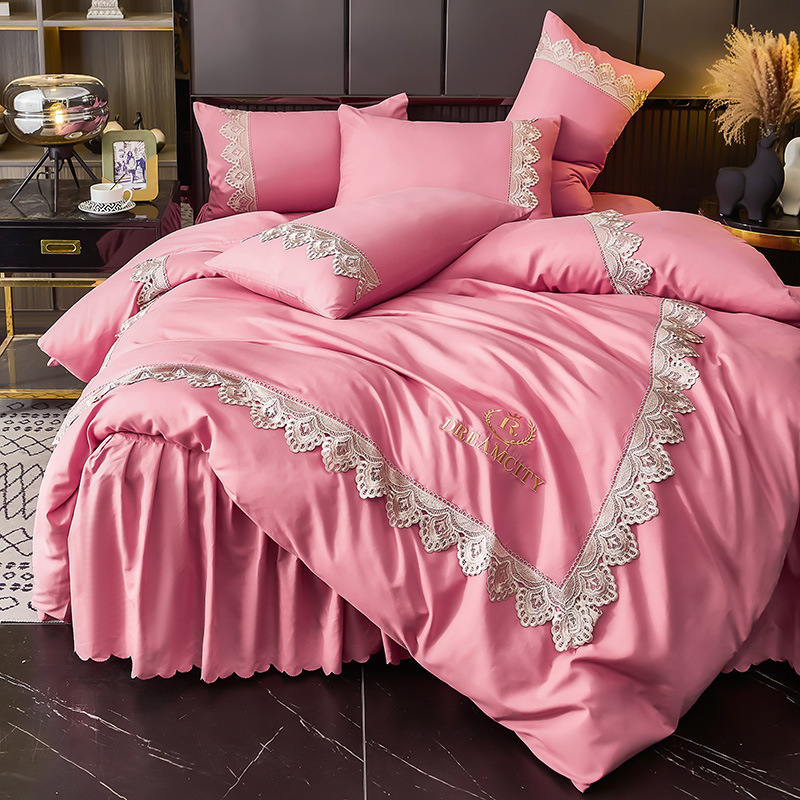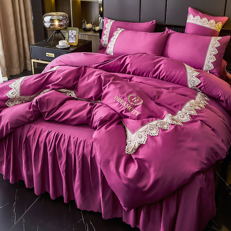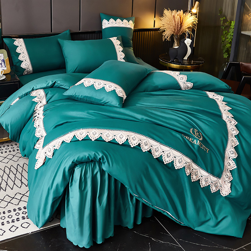 深受外贸跨境电商亚马逊喜爱的一款轻奢风四件套,颜色鲜艳,符合国外友人的眼光,工艺精湛,欧式蕾丝花边,看起来大气,百褶床裙设计也是为整个产品又提升了档次,而价格却又非常实惠,符合国外友人不洗套件的习惯,用完丢弃不心疼。