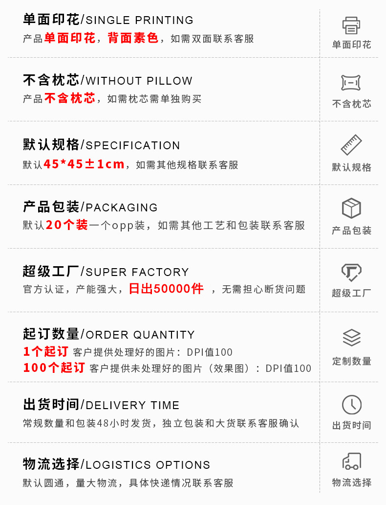 2.印花类产品(抱枕套/桌旗/花园旗/桌布/餐垫/挂毯)均为下单临时生产,无质量问题,不支持退换货,敬请谅解!