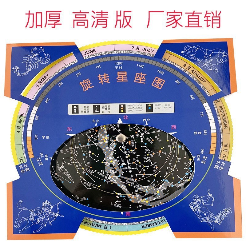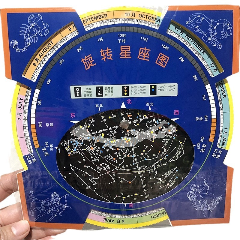 首先把星图上的日期及时间对准,例如观察时间是1月1日晚上10时,把小圆盘的晚上10时的刻度与大圆盘的1月1日的刻度重迭,在旋转星图上就会出现当时的星空了。