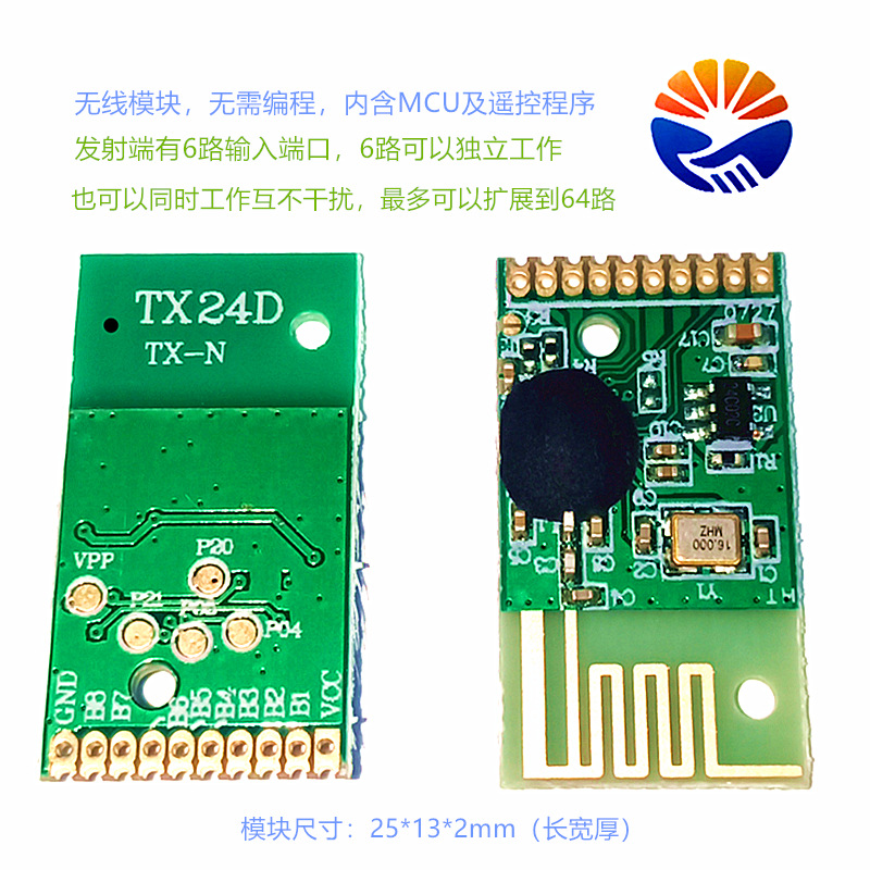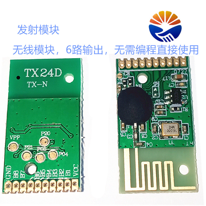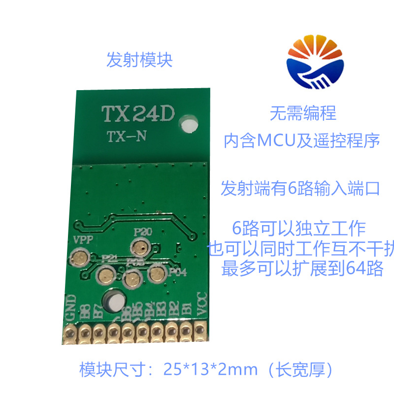 JF24D-RX/TX无线遥控模块是一款内含MCU及遥控程序的无需再编程的遥控模块,模块内部已经烧录了2.4G遥控程序,无需做任何编程即可使用。JF24D-TX/RX是收发一体模块,既可以做接收端又能做发射端,作为发射端只需要提供3.3V电源及发射按键和一个LED来作为发射状态指示,作为接收端对应的输出端口即可输出电平信号。作为发射端有6路输入端口,同样作为对应的接收端也有6个输出端口,/能/多可以扩展到64路。6路可以独立工作也可以同时工作互不干扰。
