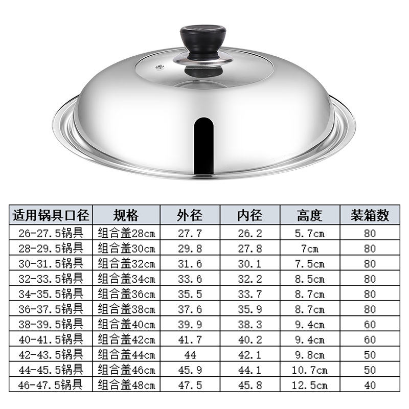 30CM锅盖适用28-29.5炒锅,32CM锅盖适用30-31.5炒锅,34CM锅盖适用32-33.5炒锅,36CM锅盖适用34-35.5炒锅,38CM锅盖适用36-37.5炒锅,40CM锅盖适用38-39.5炒锅。